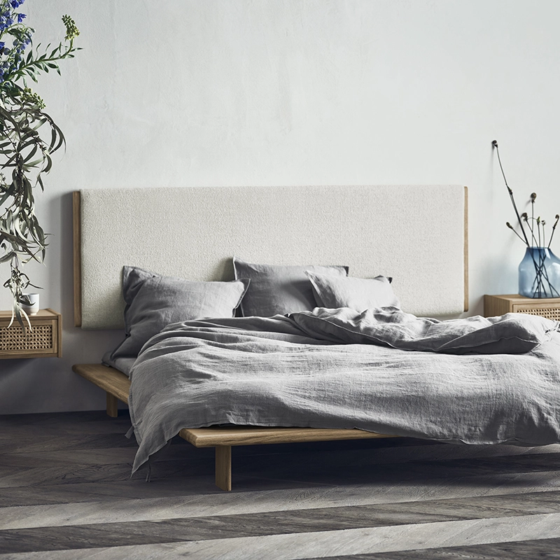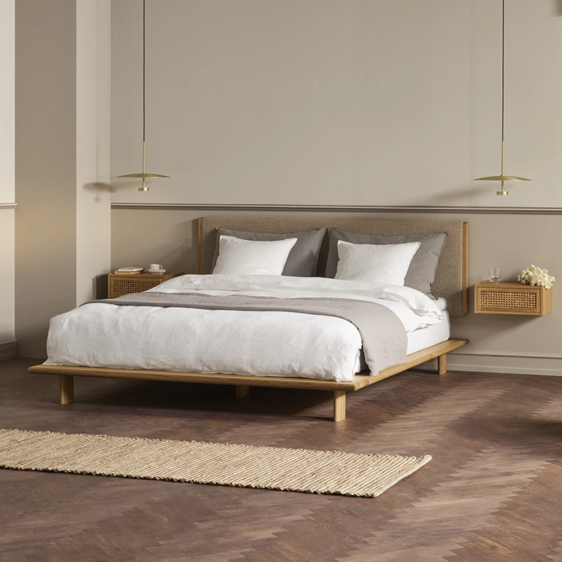 Published by Bolia, Haven is a minimalist bed frame. It has a wide shape that gives the furniture a refined expression and functional depth. It also has an ideal surface for your morning coffee or a book. The Haven bed is distinguished by its natural, strong and durable materials, as well as its handcrafted details. To complement this, designers Steffensen & Würtz have also created a wall-mounted headboard for a truly welcoming and comfortable bedroom.
