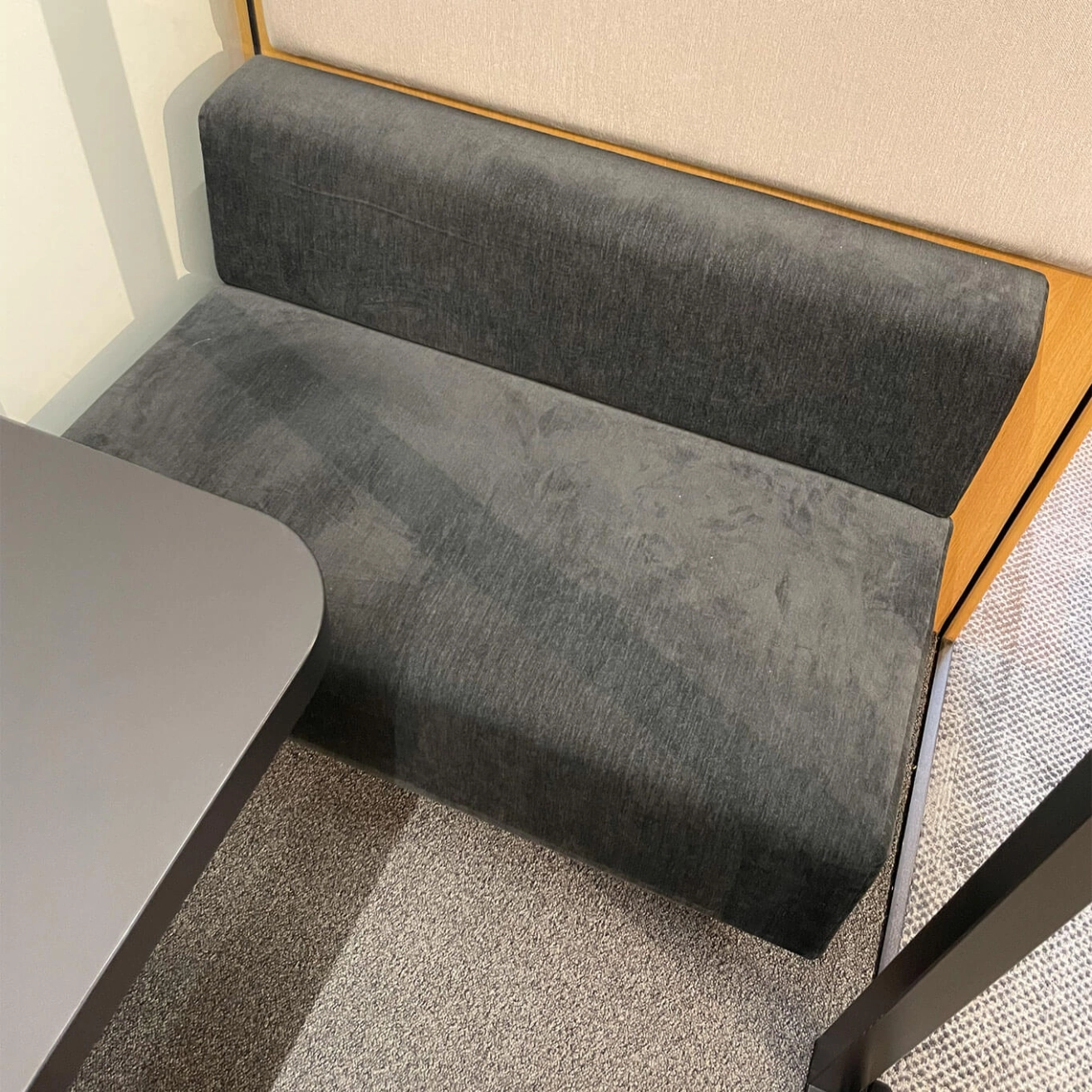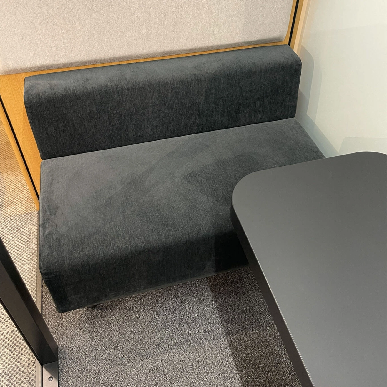 Gabriel Noir Cura 60999 fabric (100% recycled polyester), FSC-certified oak, clear glass, dark gray 94 carpet (85% polyamide, 15% polypropylene)