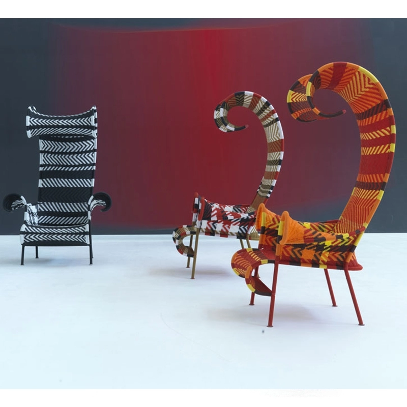 The M'Afrique collection is the result of a project launched by Moroso, which offers designers the opportunity to transpose the beauty of Africa throughout a collection of furniture. Tord Boontje was inspired by the bright colours and ethnic prints of Africa when creating the Shadowy armchair. Each piece is made in Africa from start to finish by local artisans who hand-weave plastic threads, a technique traditionally used to make fishing nets. Shadowy armchair combines organic shapes with a traditional technique to create very modern results and an "exochic" effect. Positioned somewhere between a throne and a gigantic plant, this outdoor armchair forms a comforting cocoon thanks to its oversized backrest. A true masterpiece illustrating the poetry and eccentricity of Africa. This armchair is the result of a remarkable piece of work in which countless multicoloured plastic threads were meticulously woven into highly graphic, geometric shapes. This Dutch designer has created a collection in which original curves give the feeling of being wrapped up and protected while being proudly enthroned in the garden.