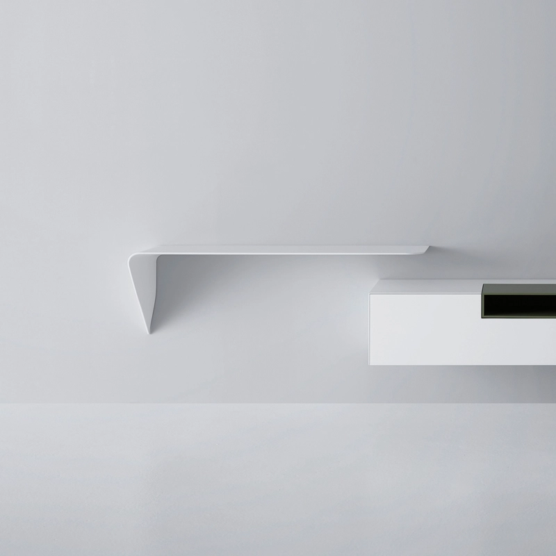 Designed by Victor Vasilev, Mamba Light is both a small wall-mounted desk and a shelf. Discreetly elegant, this piece of furniture made from Cristalplant is produced by MDF. Its undulating shape and the elegance of its lines create a design with strong character and real beauty. Wall-mounted, Mamba Light takes up very little room and is therefore perfect for small spaces. Both visually light and sculptural, this wall-mounted shelf works well in interiors of all styles. The ribbon-like Mamba Light seems to emerge from the wall and disappear into it as needed.