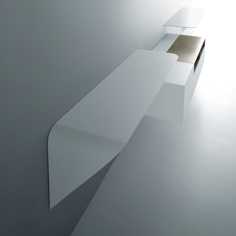 Designed by Victor Vasilev, Mamba Light is both a small wall-mounted desk and a shelf. Discreetly elegant, this piece of furniture made from Cristalplant is produced by MDF. Its undulating shape and the elegance of its lines create a design with strong character and real beauty. Wall-mounted, Mamba Light takes up very little room and is therefore perfect for small spaces. Both visually light and sculptural, this wall-mounted shelf works well in interiors of all styles. The ribbon-like Mamba Light seems to emerge from the wall and disappear into it as needed.