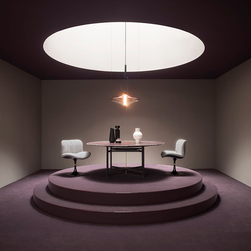 Marilyn is an elegant and comfortable chair. It consists of a rigid frame in matt black lacquer and a swivel base in matt black lacquered metal. The seat and back of the