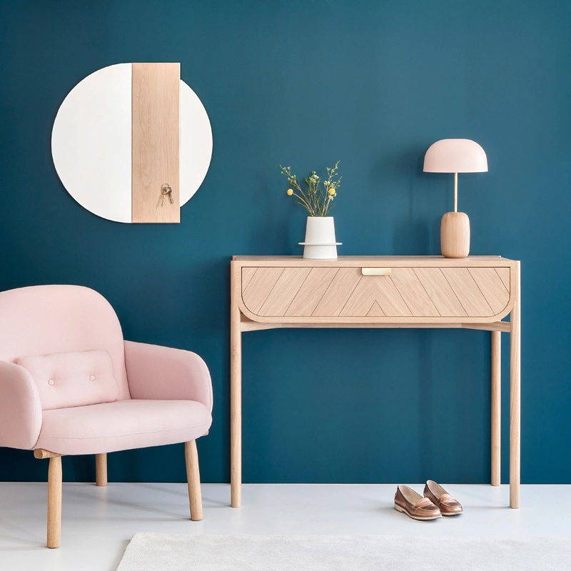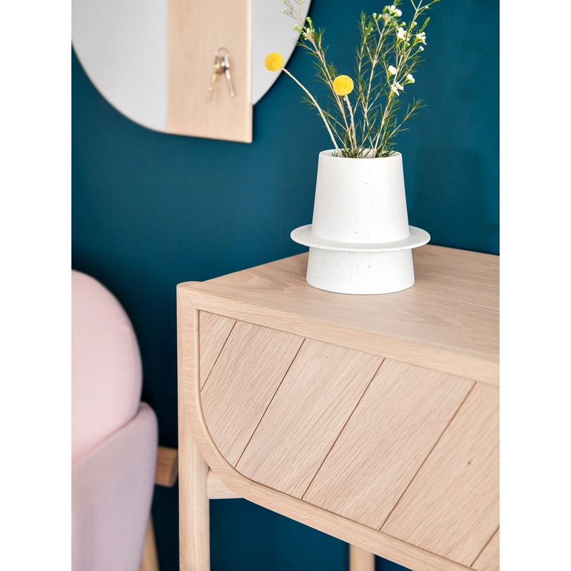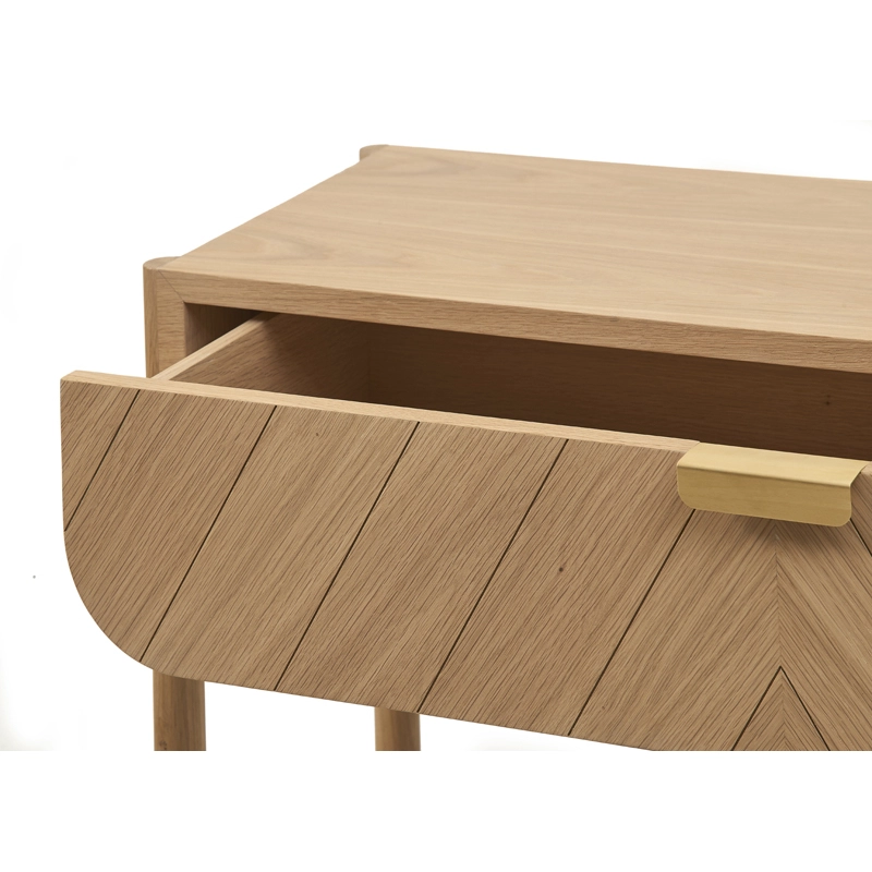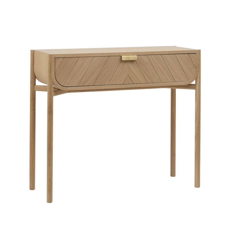 Inspired by the maritime world, the Marius consolefrom Harto displays a warm, authentic natural oak finish, paired with a drawer available in natural oak, light grey or petrol blue The overall shape of Marius evokes the hull of a boat, while the oblique grooves that elegantly dress its front outline its sails. It is adorned with attractive gilded metal handles. Elegant and sleek, the console Marius in oak has it all!