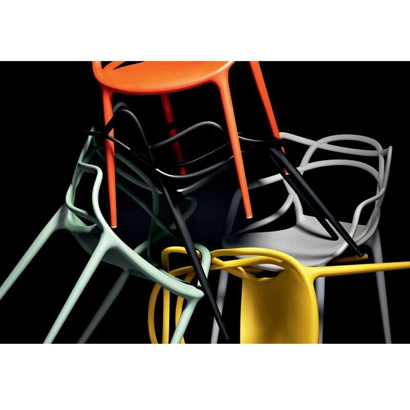 Designers Philippe Starck and Eugeni Quitllet pay tribute to three icons of contemporary design and bring to life a fusion of styles to achieve a "stylistic synthesis". Indeed, the interweaving of sinuous, dynamic lines on the back of the Masters Chair, evokes the silhouettes of three contemporary design classics: Arne Jacobsen's Series 7, Eero Saarinen's Tulip Armchair and Charles Eames' Eiffel Chair. Created in 2009, the Masters chair by Kartell has already achieved design icon status. These chairs intertwine to create an original and captivating fusion of styles. Supported by four slender rods, the seat of the petit fauteuil Masters is ample and comfortable. The distinctive feature of the Masters chair lies essentially in its backrest, characterised by the solids and voids created by the curvilinear intersection of the three different backrests that merge into the seat. The exceptional finish of the Masters chair results from the excellent quality of the materials and the finesse of the lines. Indeed, the Masters chair is also distinguished by a velvety feel of great sensuality. Made from polypropylene, the Masters chair is ultra original, roomy and comfortable. Lightweight, practical and stackable, the Masters chairfrom the Italian house Kartell is available in several colours and can be used both indoors and outdoors. This international bestseller won the Good Design Award in 2010 and the Red Dot Award in 2013.
