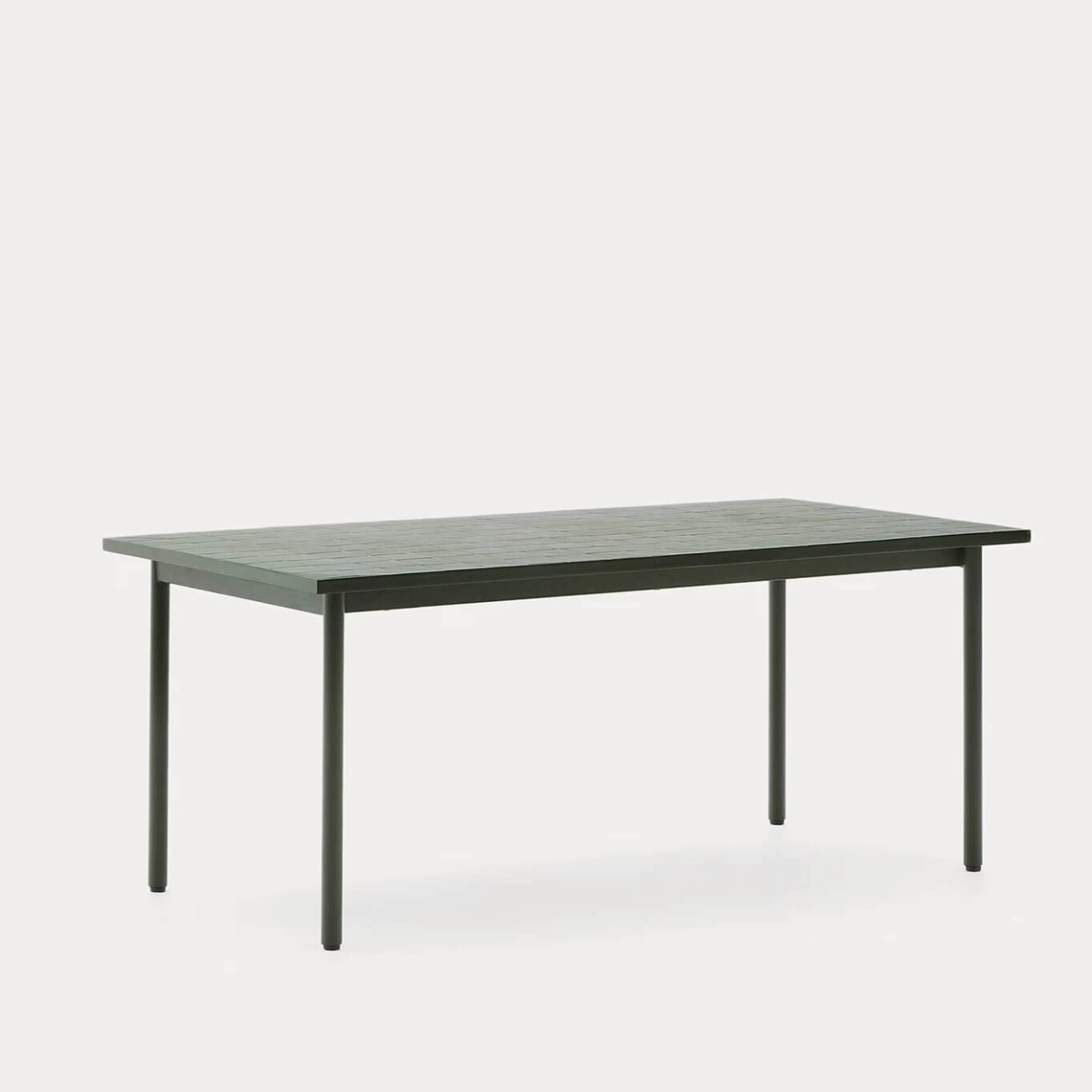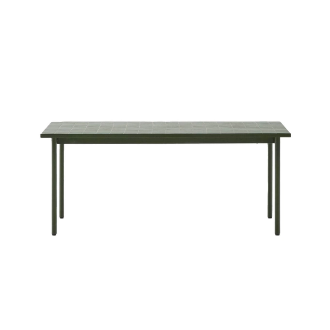 table made of green galvanized steel with a green ceramic tabletop measuring 223 x 101 cm, designed by