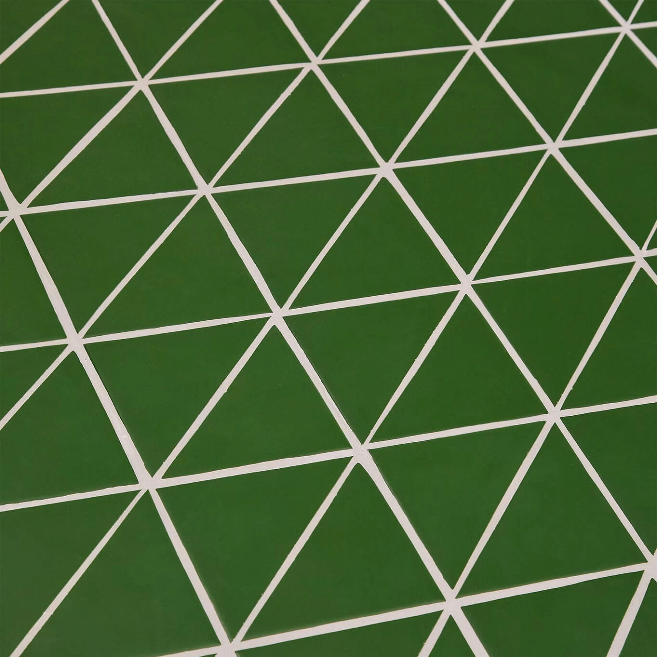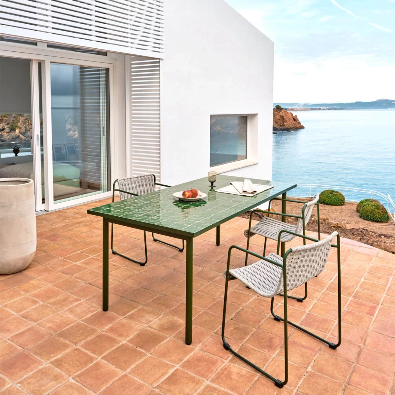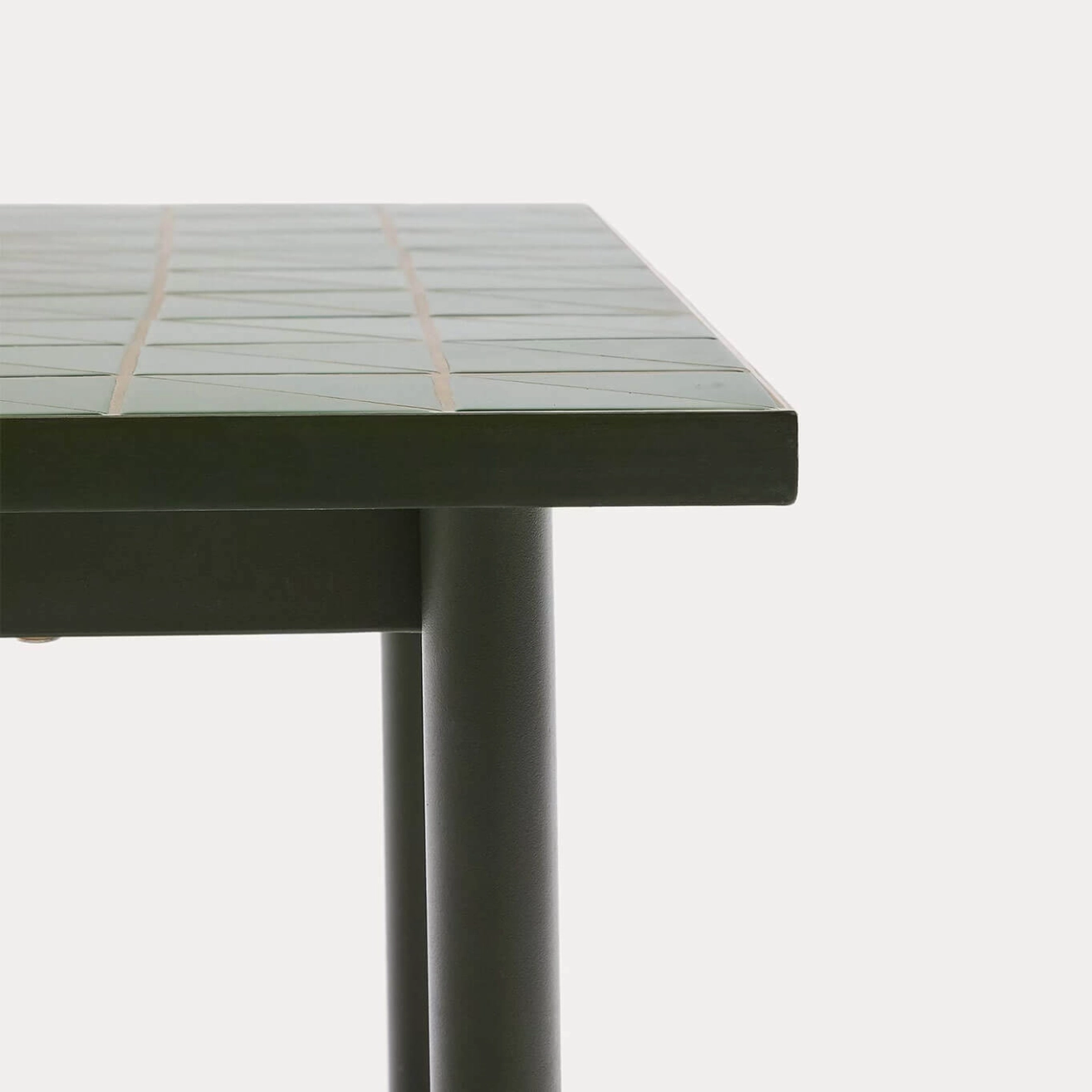 Kave Home and exclusively created by Yonoh Studio. This Mediterranean-inspired collection combines traditional craftsmanship with contemporary design: each tile of the geometric ceramic mosaic tabletop is carefully placed by hand, making every piece unique. The green galvanized steel frame provides excellent resistance to oxidation and corrosion, while the plastic protections on the feet safeguard the floor. Suitable for both indoor and outdoor use, this