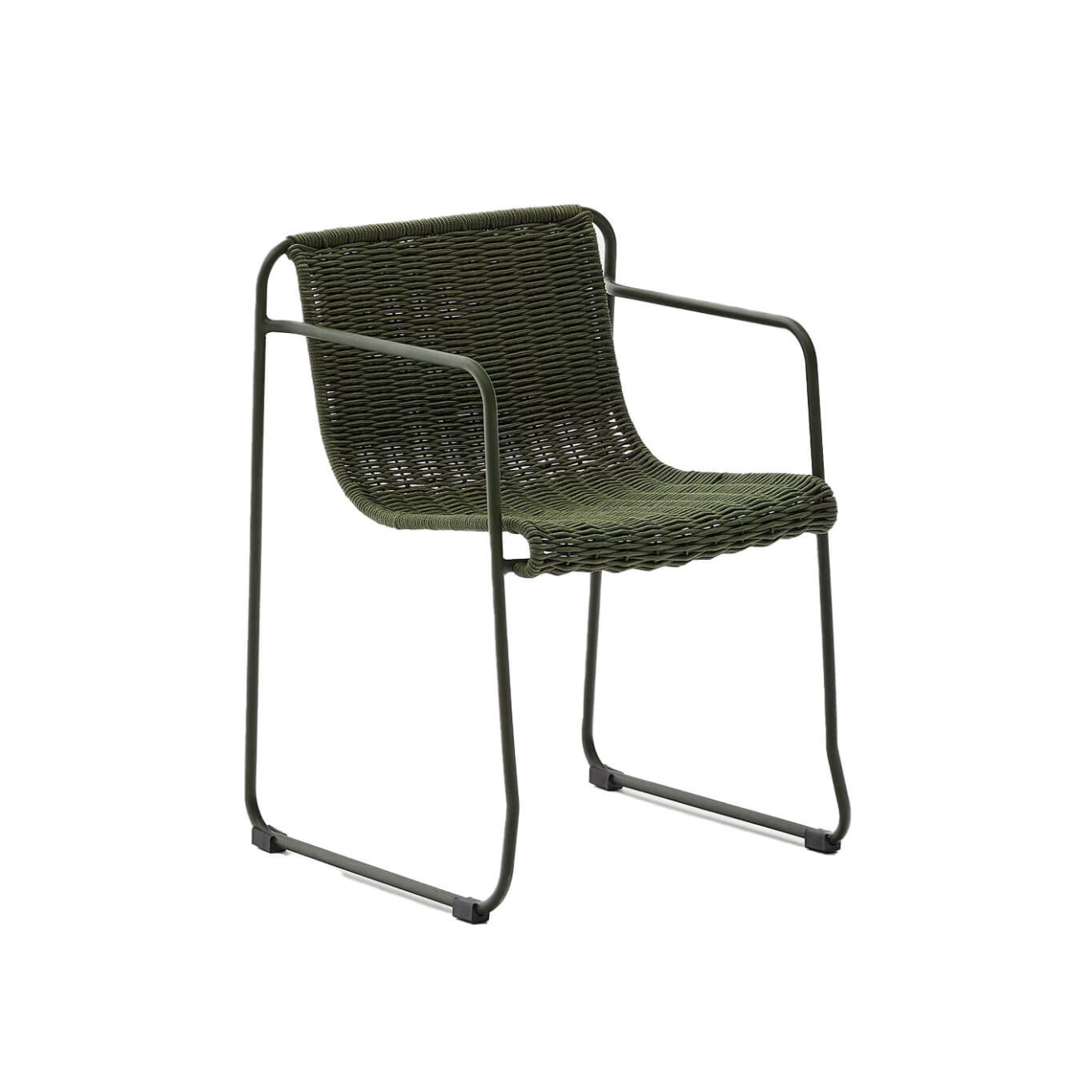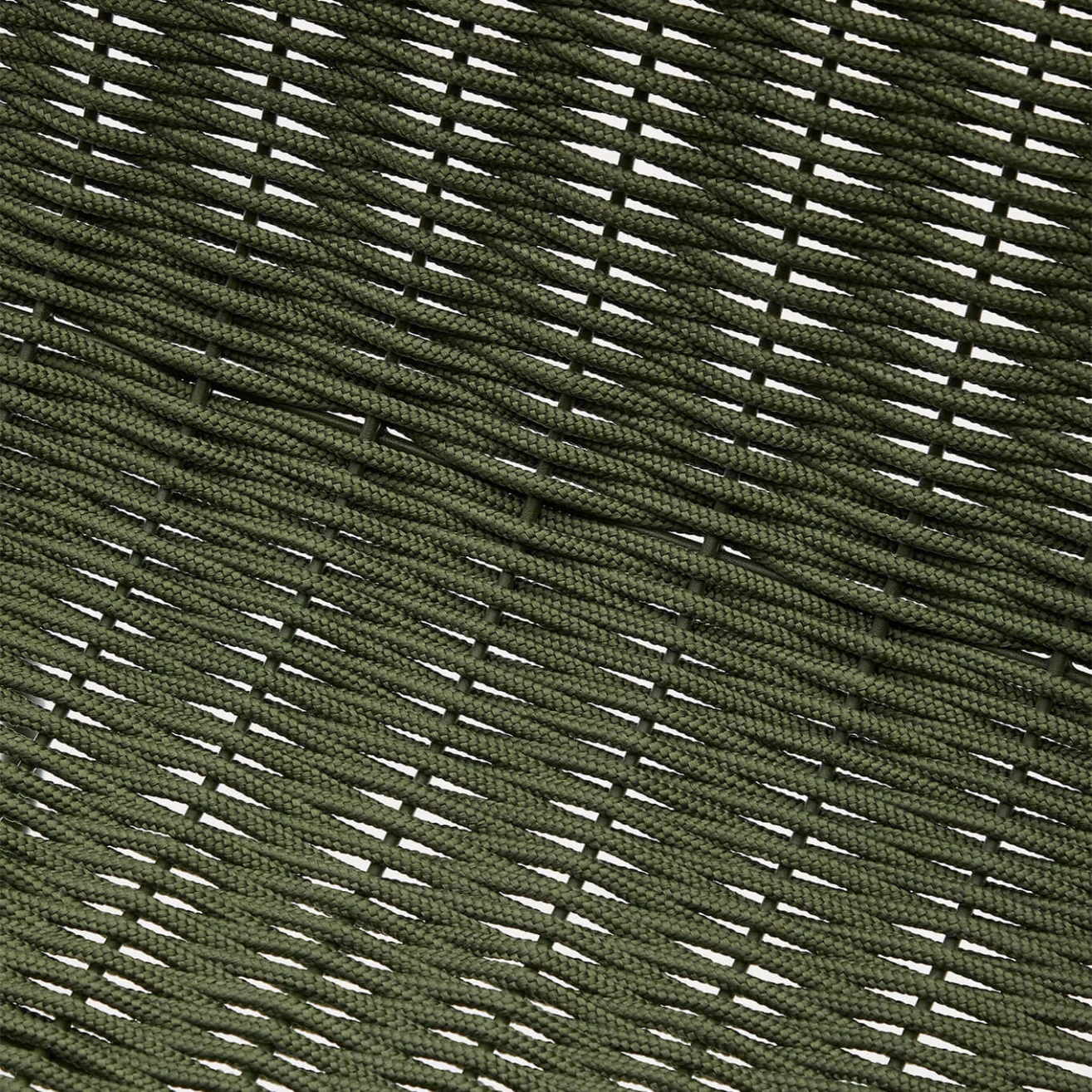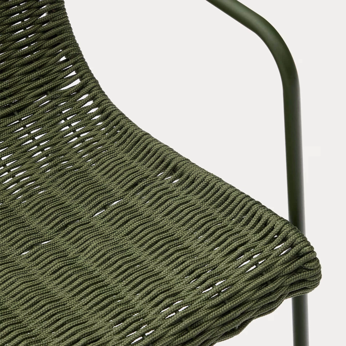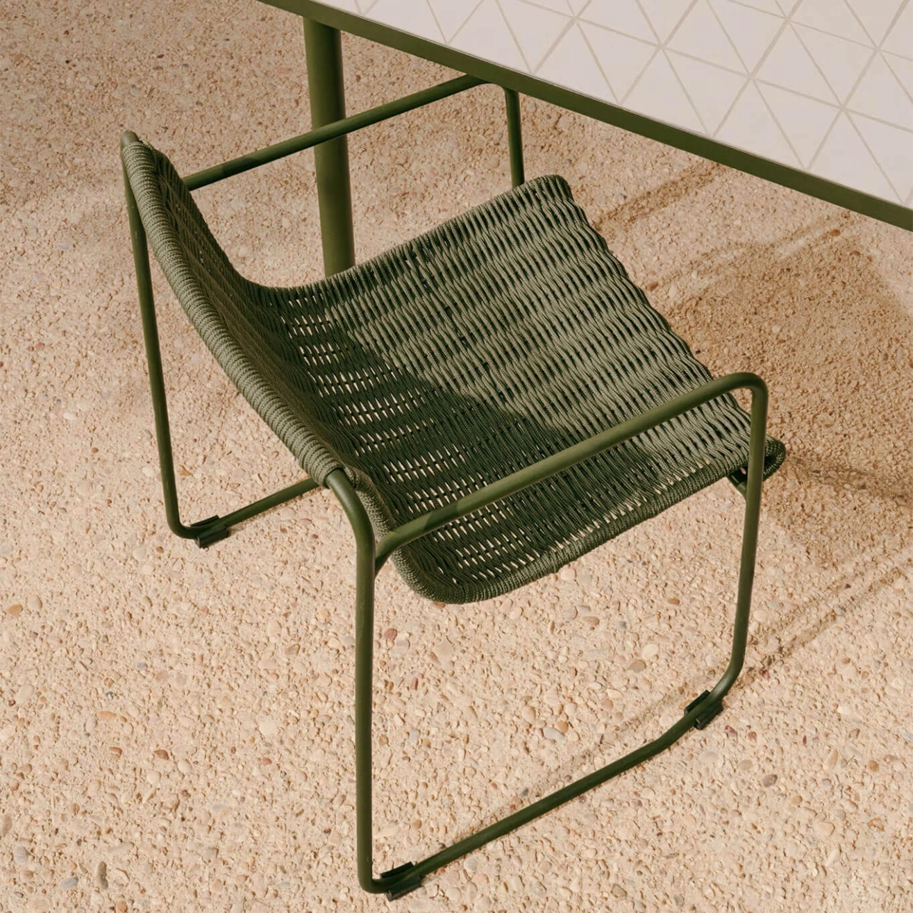 Maurina is a chair made of green galvanized steel with a hand-woven green rope seat and backrest from the