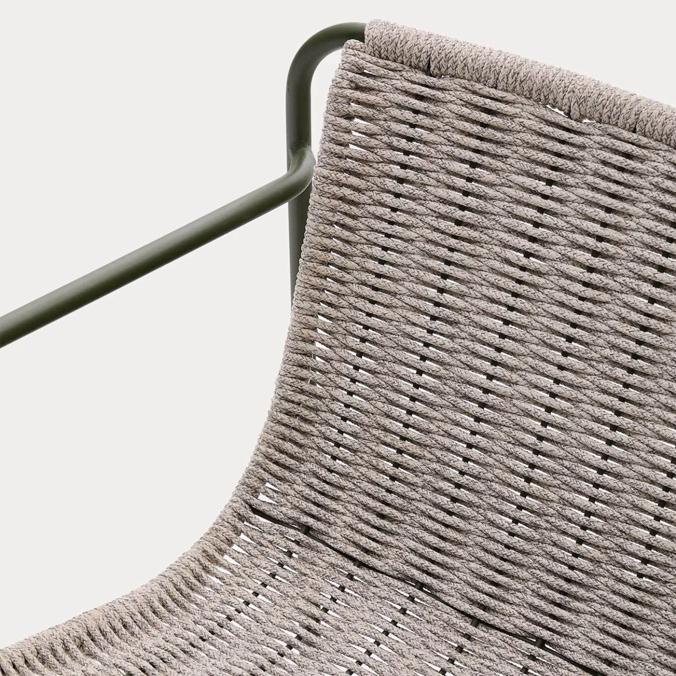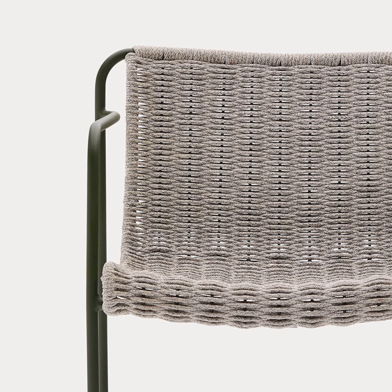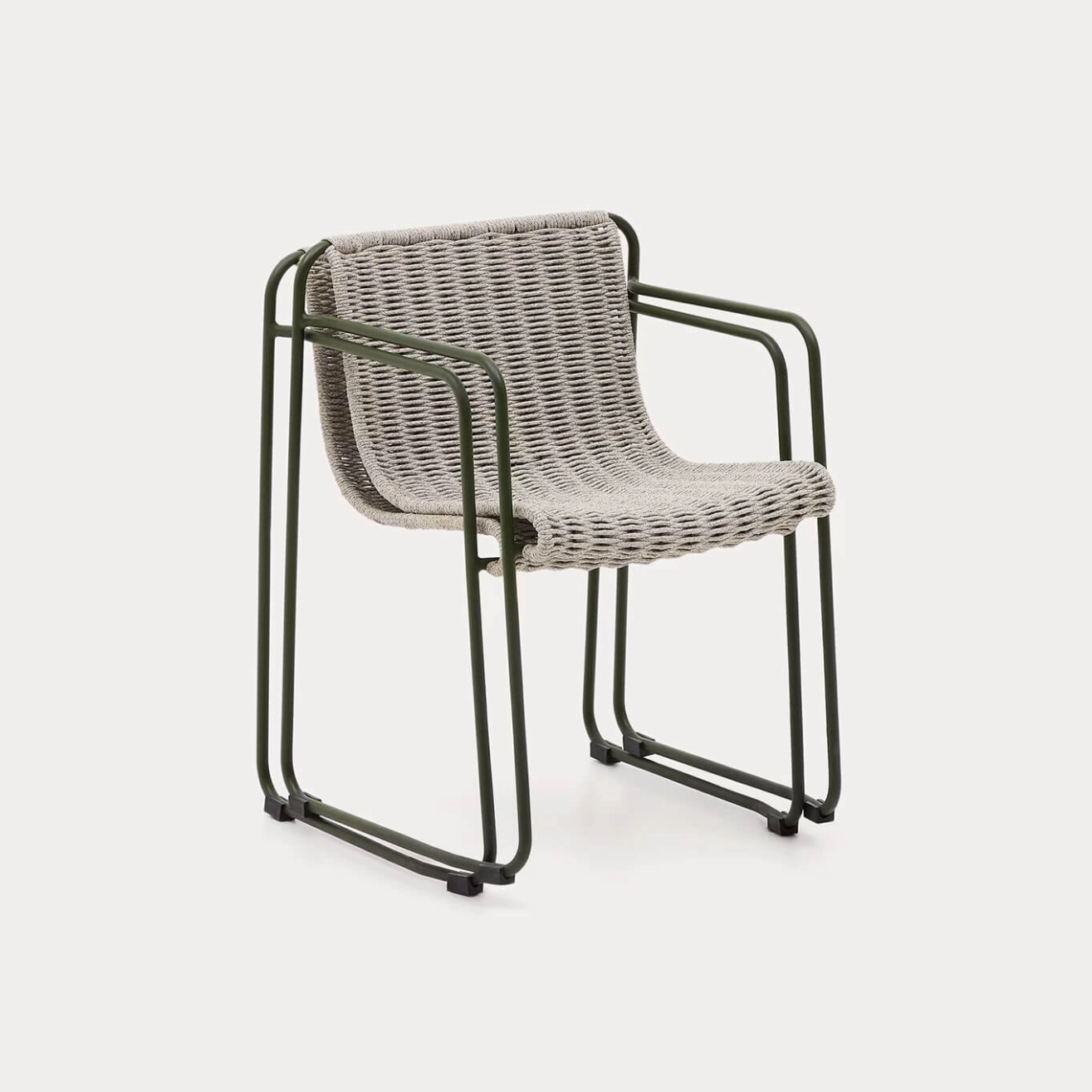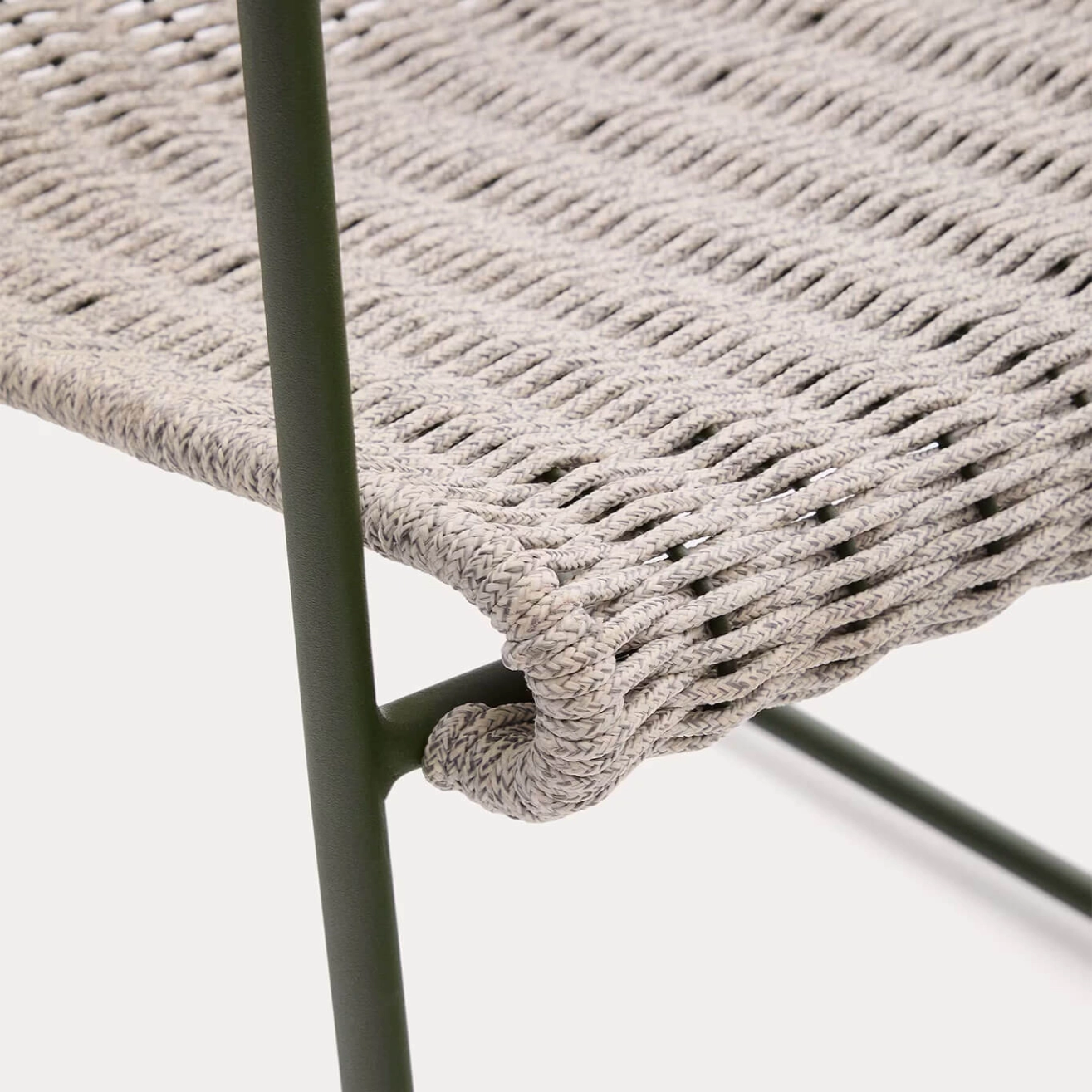 Maurina is a chair featuring a hand-woven seat and backrest in UV-resistant ecru and grey cord, combined with a green galvanized steel structure that offers superior resistance to oxidation and corrosion. Exclusively designed for Kave Home by Yonoh Studio, this piece reinterprets Mediterranean style through a contemporary and vibrant lens. Its sled-style frame and generous seat dimensions ensure exceptional comfort, while its handcrafted cord weaving highlights both durability and artisanal quality. Part of the Maurina collection, it blends traditional materials with modern lines, making it an ideal choice for creating an outdoor space that is both timeless and refreshingly current.