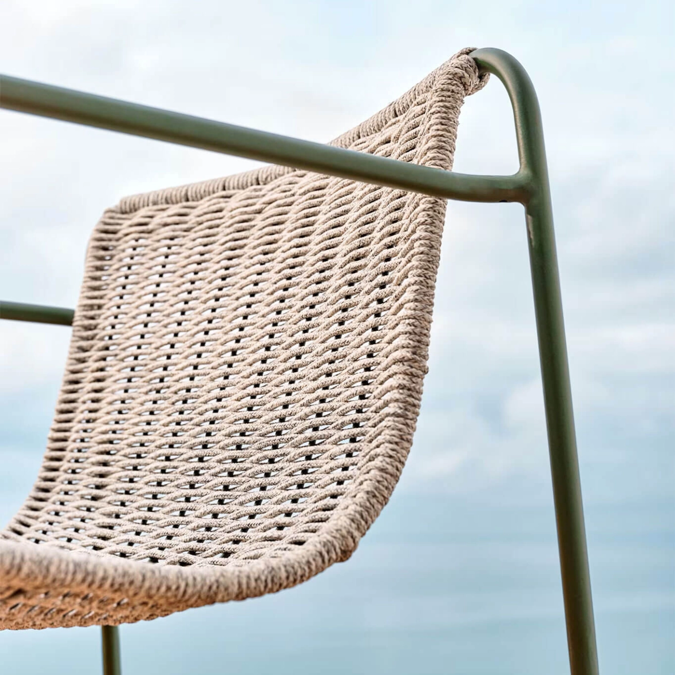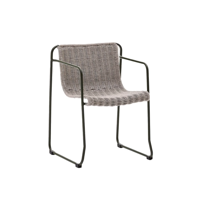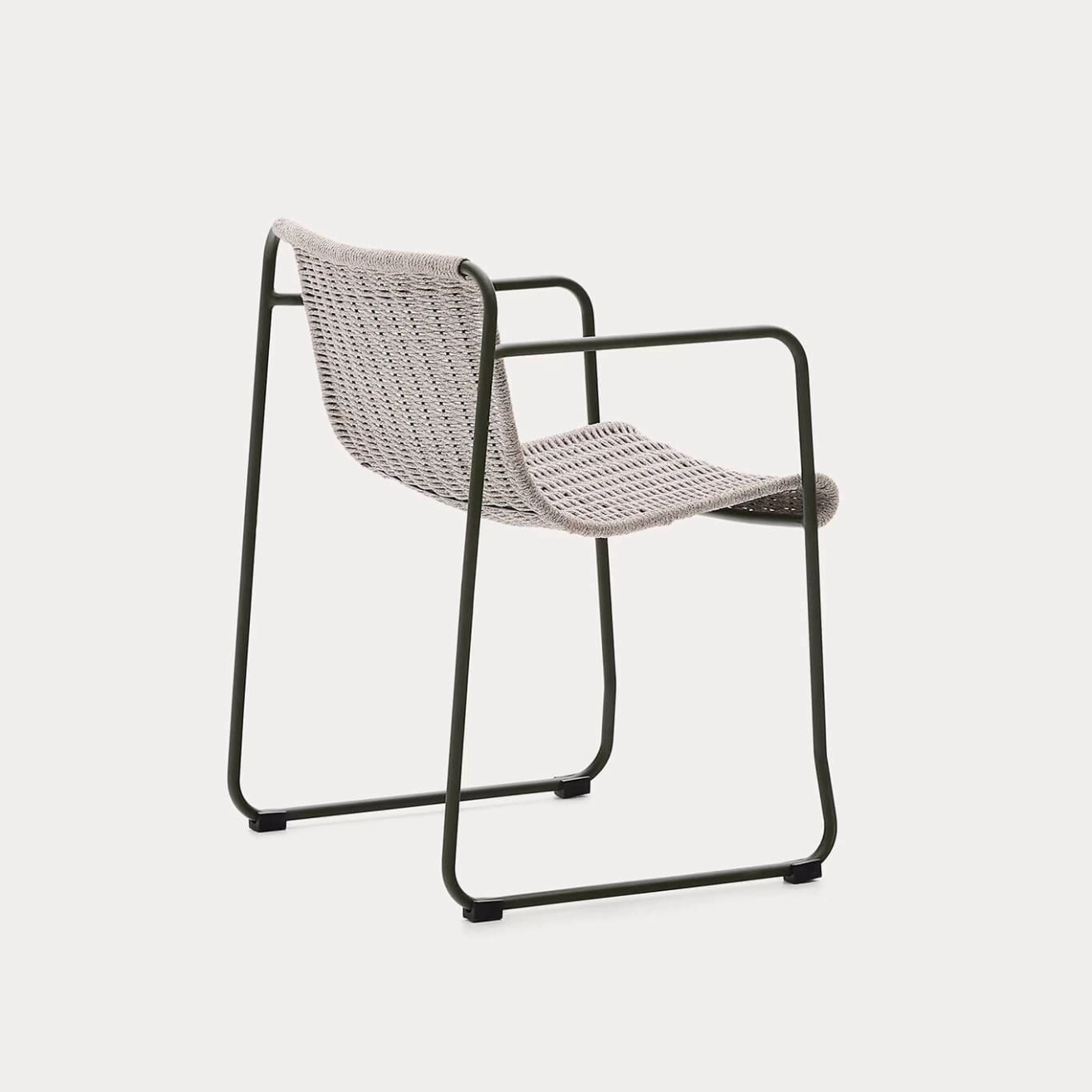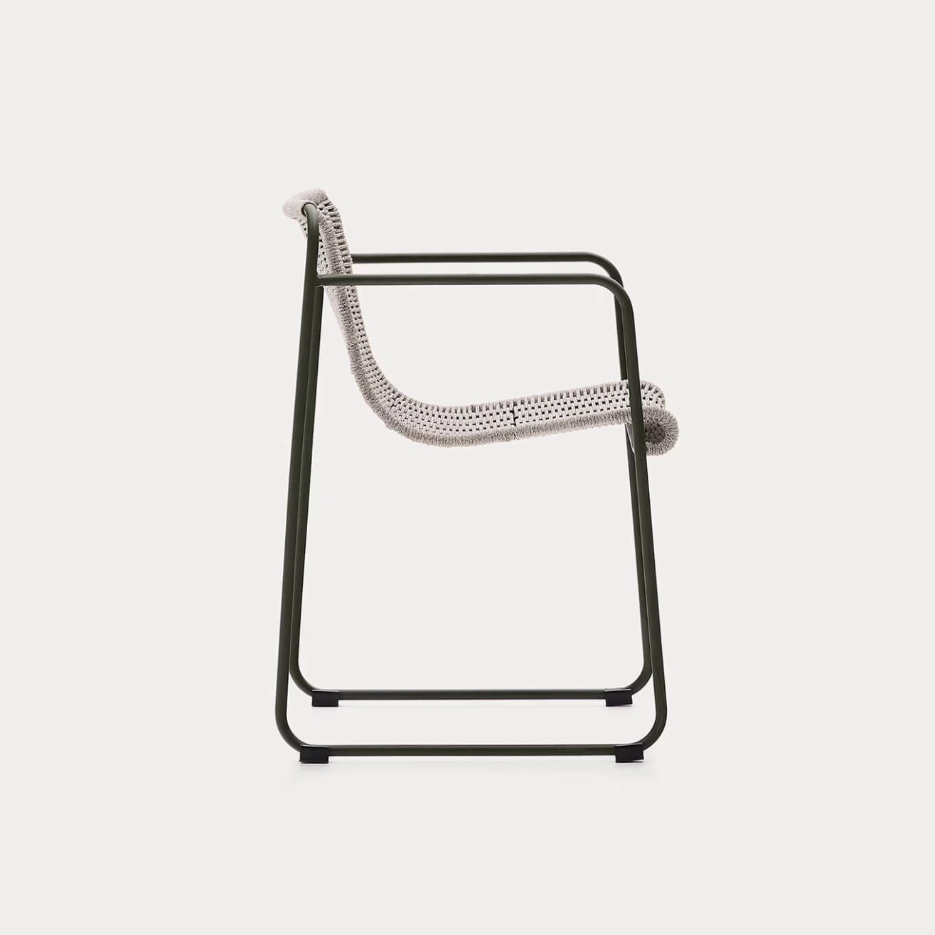 Maurina is a chair featuring a hand-woven seat and backrest in UV-resistant ecru and grey cord, combined with a green galvanized steel structure that offers superior resistance to oxidation and corrosion. Exclusively designed for Kave Home by Yonoh Studio, this piece reinterprets Mediterranean style through a contemporary and vibrant lens. Its sled-style frame and generous seat dimensions ensure exceptional comfort, while its handcrafted cord weaving highlights both durability and artisanal quality. Part of the Maurina collection, it blends traditional materials with modern lines, making it an ideal choice for creating an outdoor space that is both timeless and refreshingly current.