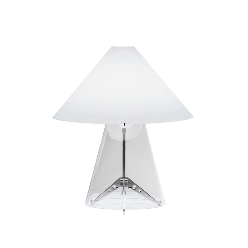 Metafora table lamp, made up of a conical opaline glass shade fitting over a transparent glass base that covers the metal structure.