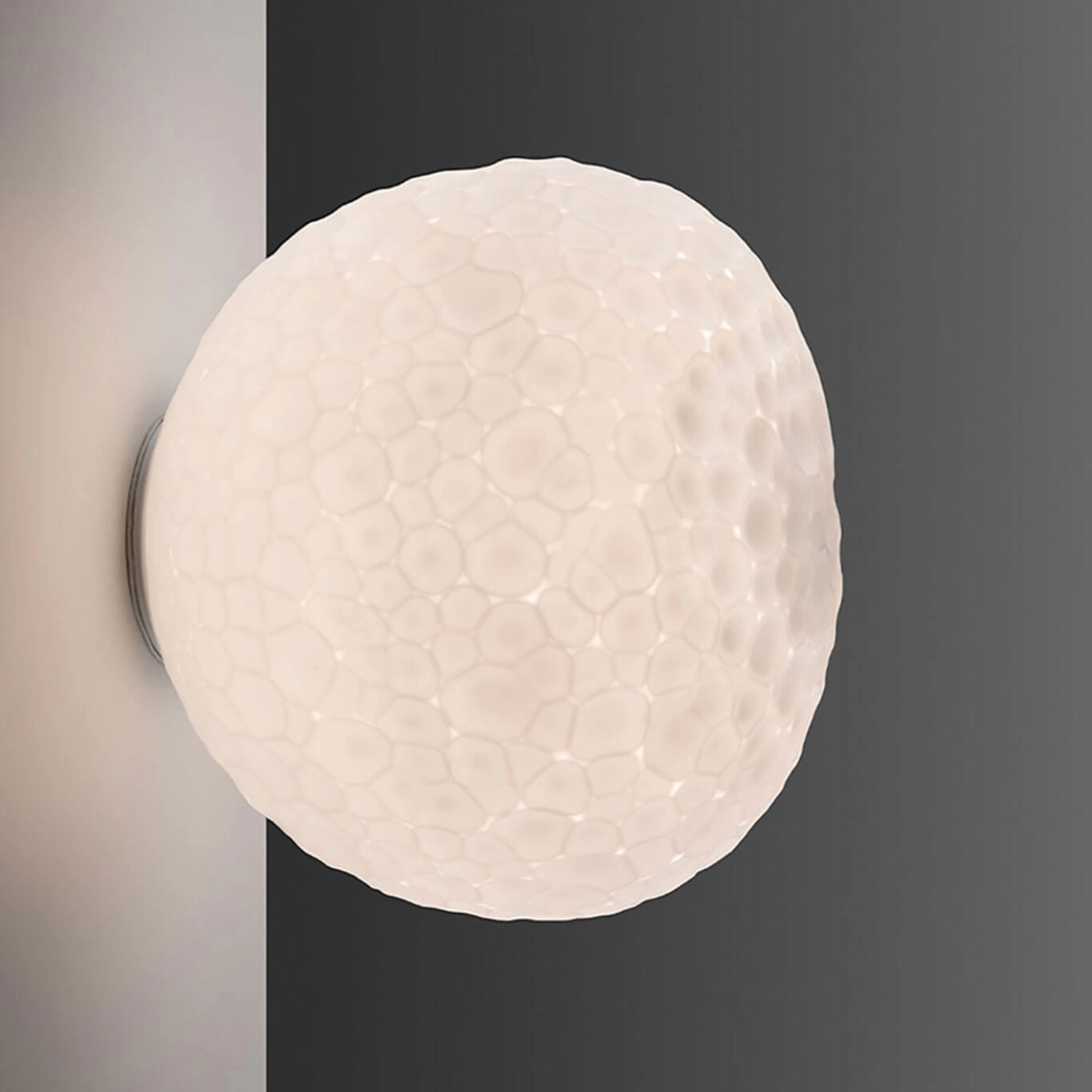 The Meteorite 15 Wall/Ceiling light by Artemide, designed by Pio & Tito Toso, is a luminous creation that is both poetic and sophisticated. Its diffuser, handcrafted in double-layer artistic glass, is the result of exceptional artisanal expertise. Created using the traditional technique of glass-blowing into a fixed mold and then delicately ground, the glass evokes the unique texture of Murano’s “battuto” glass. This process gives each piece its own distinct character and a rich, tactile surface. Thanks to this meticulous craftsmanship, the light emitted by the Meteorite 15 is soft, warm, and full of life, ideal for creating a cozy and intimate atmosphere, whether used as a wall sconce or ceiling light. A true light sculpture by Artemide, where the art of glassmaking meets contemporary innovation.