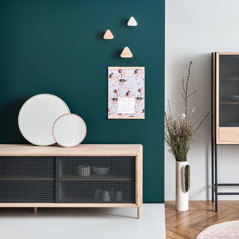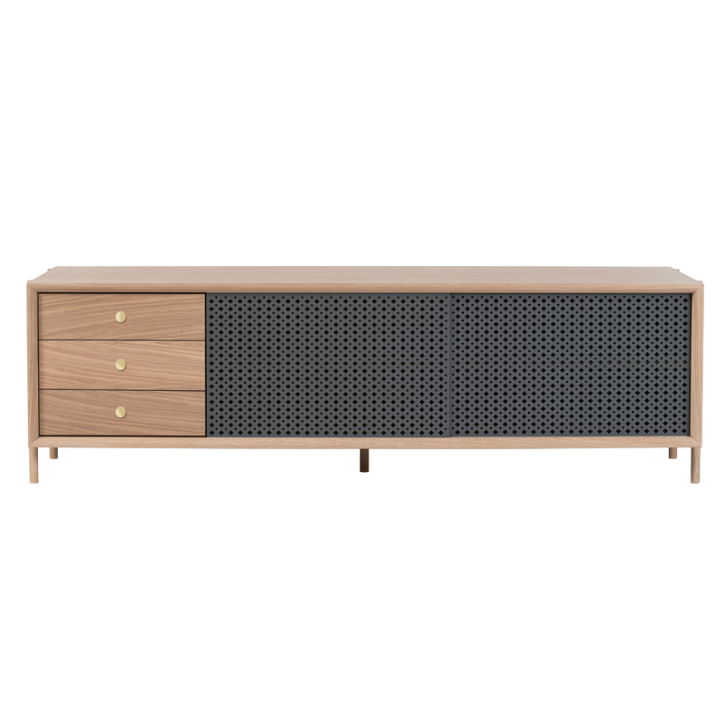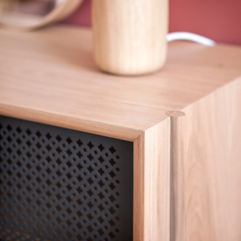 Designed by Mathieu Galard, Hartô's artistic director, Gabin is a storage collection that combines simplicity of form and beauty of materials. Its main distinguishing features are the cane-inspired motif and the combination of wood and metal. This elegant low sideboard has two openwork sliding doors and three drawers with brushed brass handles. It is also available without drawers. With its sleek silhouette and graphic door motif, the Gabin design sideboard will look at home in any contemporary interior. The drawer unit can be unscrewed to be positioned on the left or right.
