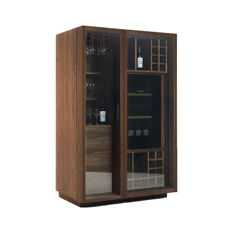 Published by the Italian house Riva 1920, Cambusa Wine Glass is a multifunctional storage unit, combining elegance and practicality. Made from solid wood, it features glass doors with a 180° opening angle. The interior of Cambusa Wine Glass is designed with dedicated compartments for glasses and bottles. It is also equipped with an LED system running the full height of the central pillar, providing automatic lighting activated by sensors when the doors are opened. Transparent glass doors with solid walnut frames, pull-out drawers and shelves with push-pull system on metal runners are all details that underline the refinement and functionality of the Cambusa Wine Glass from Riva 1920.