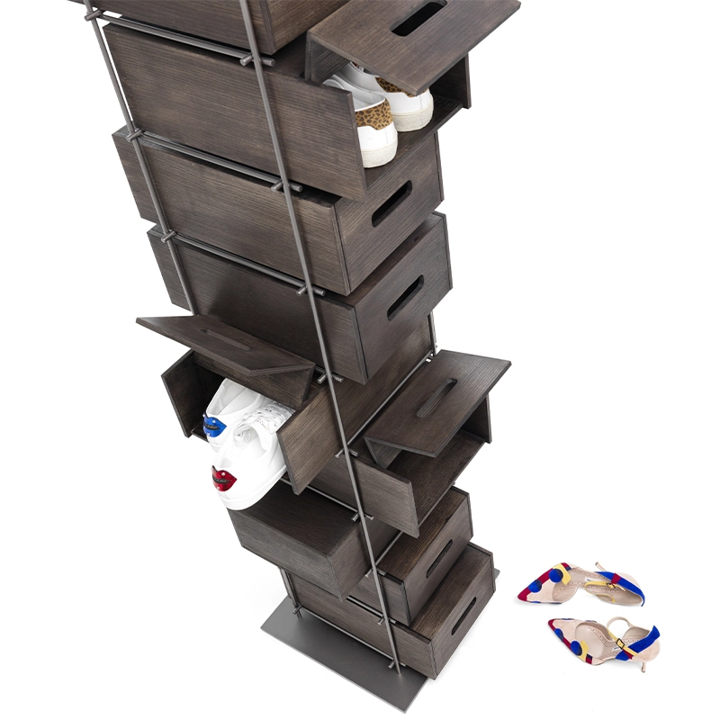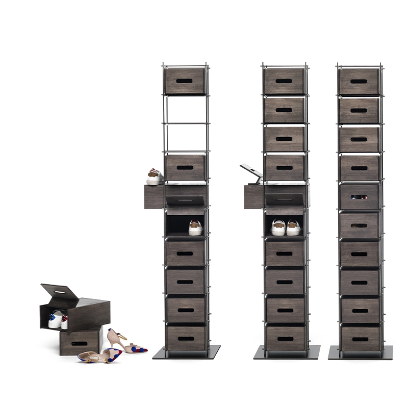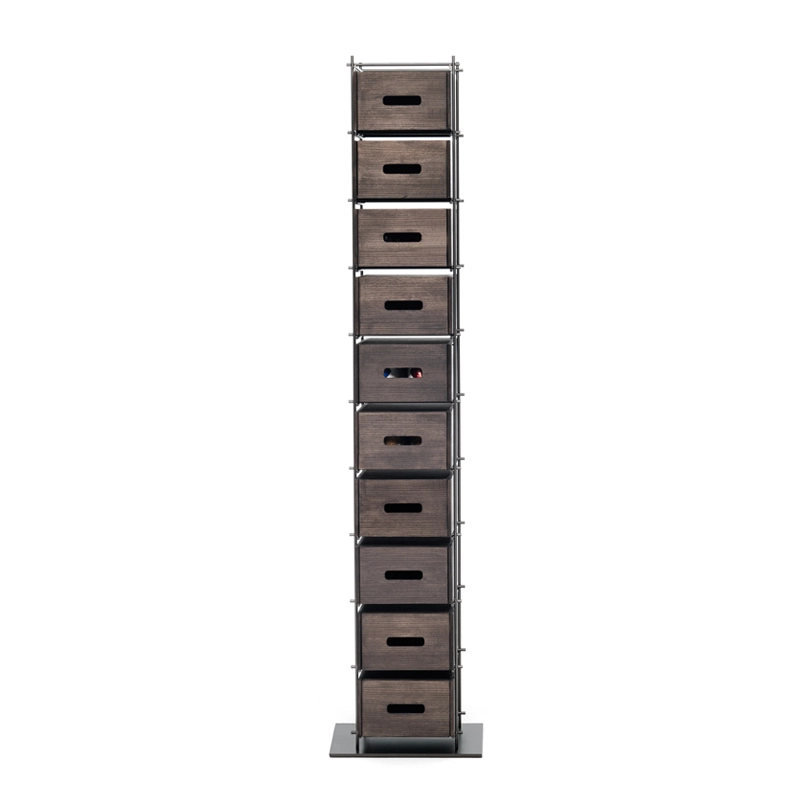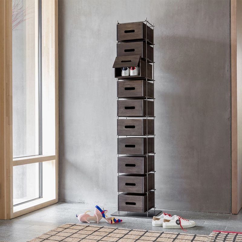 Manolo is a shoe storage unit featuring a burnished metal frame and solid mocha-coloured stained ash drawers. It includes 10 fully removable shoe boxes that open wide. This original storage unit was born of the idea of reinventing a product that has always been considered secondary and rarely thought of as a piece of designer furniture. With