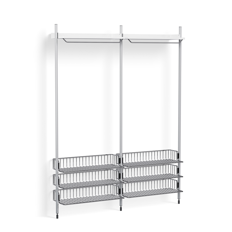Designed by the famous designers Ronan & Erwan Bouroullec, Pier System is a multifunctional storage system, developed to adapt to modern living conditions. Delivered flat-packed and easy to assemble, reconfigure and recycle, Pier System's simple, flexible construction makes it ideal for storing and organising many different types of object. Made from aluminium and steel using the minimum of components needed for a complete storage system, Pier System is available in different colours and numerous configurations, which can be combined together. The elements of the configurations can be moved according to need or desire, to integrate the functions you want. Published by Hay, the Pier storage system finds its place in every room of the house, be it the living room, bedroom, hallway or study. It is also suitable for contract spaces. The 1022 configuration has two shelves with wardrobes and six steel wire shelves.