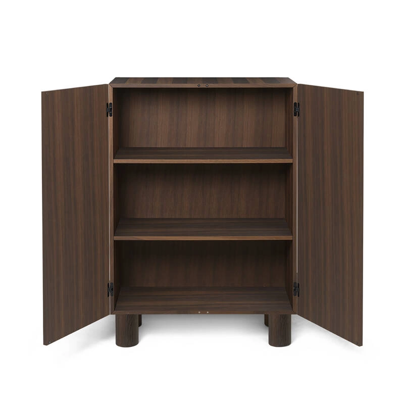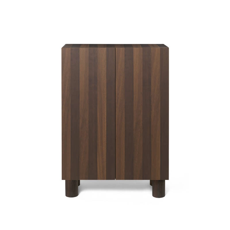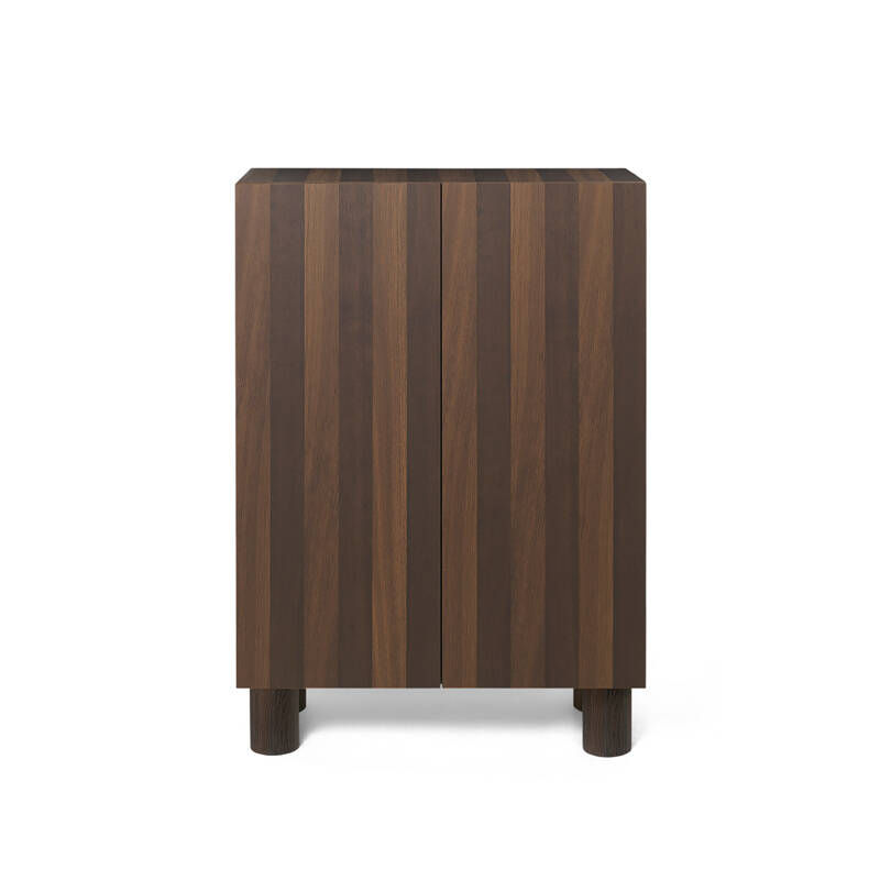 Inspired by the Brutalist movement, Post plays with volumes to create striking storage with seductive details. This small wardrobe is made from FSC-certified wood with a surface featuring a striped marquetry pattern. To preserve this simple yet artistic motif, the doors of the Ferm Living storage unit open using a hidden mechanism, avoiding visible handles.