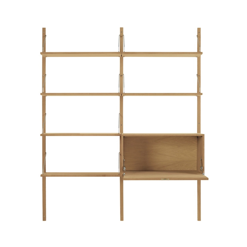 Published by DK3, the iconic Royal System shelving system was designed in 1948 by Danish designer and manufacturer Poul Cadovius. It's one of the world's first wall-mounted furniture systems, created on the innovative principle of moving furniture from the floor to the walls. Poul Cadovius saw a challenge in traditional heavy furniture, and wanted to add more space and light to the furniture. Royal System consists of wooden wall rails, shelves with brass or stainless steel hangers and various cabinets. The system can be customised in many individual combinations - either as a modern office system or as a bookcase with different cabinets.  Already in the 1960s, Royal System was known for its versatile design and was dubbed the shelving system offering "up to 16 million possible combinations". Since then, Royal System is still regarded as one of the greatest success stories in Danish furniture history, and so it was with pride and modesty that the DK3 brand was able to relaunch it in 2010. Although 75 years have passed since the launch of Royal System, the shelving system remains a timeless classic, with a flexible, space-saving design that offers plenty of scope for personal, modern expression.