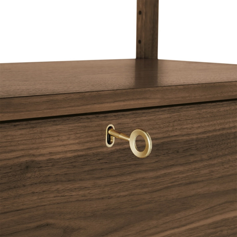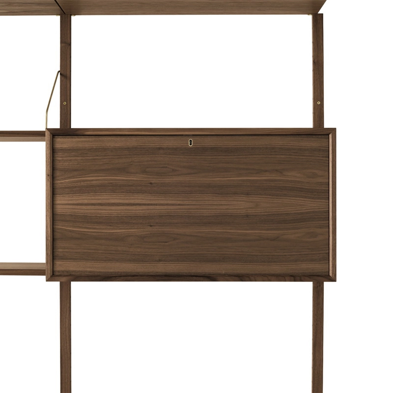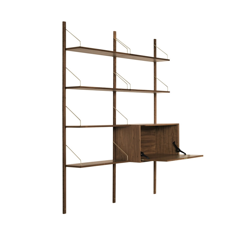 Published by DK3, the iconic Royal System shelving system was designed in 1948 by Danish designer and manufacturer Poul Cadovius. It's one of the world's first wall-mounted furniture systems, created on the innovative principle of moving furniture from the floor to the walls. Poul Cadovius saw a challenge in traditional heavy furniture, and wanted to add more space and light to the furniture. Royal System consists of wooden wall rails, shelves with brass or stainless steel hangers and various cabinets. The system can be customised in many individual combinations - either as a modern office system or as a bookcase with different cabinets.  Already in the 1960s, Royal System was known for its versatile design and was dubbed the shelving system offering "up to 16 million possible combinations". Since then, Royal System is still regarded as one of the greatest success stories in Danish furniture history, and so it was with pride and modesty that the DK3 brand was able to relaunch it in 2010. Although 75 years have passed since the launch of Royal System, the shelving system remains a timeless classic, with a flexible, space-saving design that offers plenty of scope for personal, modern expression.