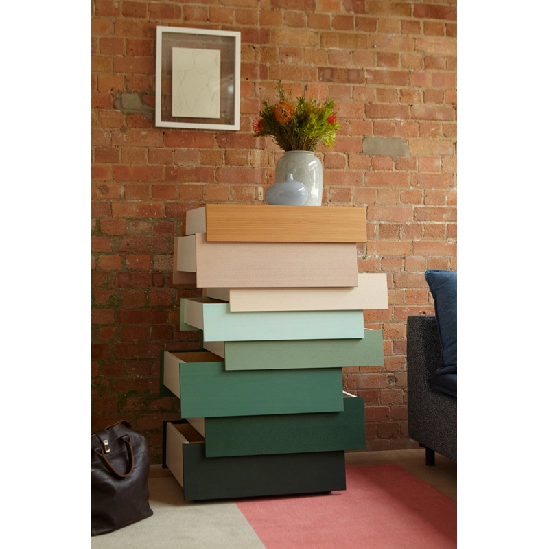 Stack is a storage collection designed by Raw Edges and Shay Alkalay for the Established and Sons brand. Defying the codes of a traditional chest of drawers, Stack consists of a combination of individual drawers that appear to be just stacked on top of each other. The drawers in Stack open in both directions, changing the silhouette of the storage unit and creating an irregular composition. Offered by Established & Sons, Stack is both a sculptural piece that can be enjoyed from every vantage point and a fully functional, highly practical storage unit. It is available in 8 or 13 drawer versions and comes in a range of cheerful colours.