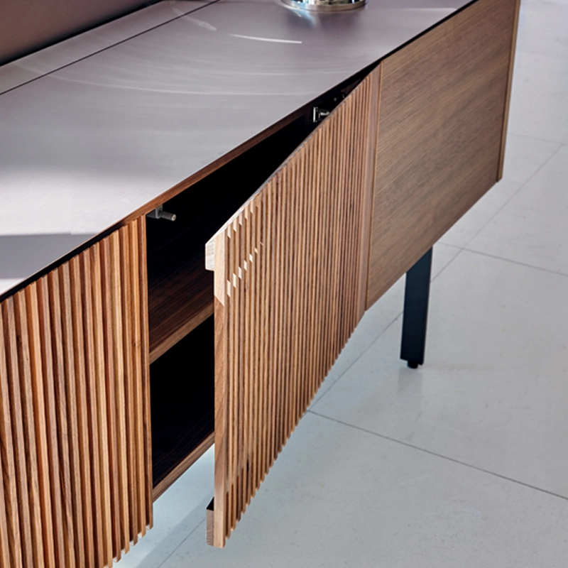 The collection of buffets Stockholm, designed by Mario Ruiz for Punt Mobles, is the winner of the 2015 Red Dot award.  Stockholm has a wooden structure and a special metal finish for the upper part of the sideboard. The storage unit Stockholm stands on a metal base with adjustable feet, so you can level the unit. Stockholm is perfect for reception rooms and even offices, for a sober, elegant ambience.
