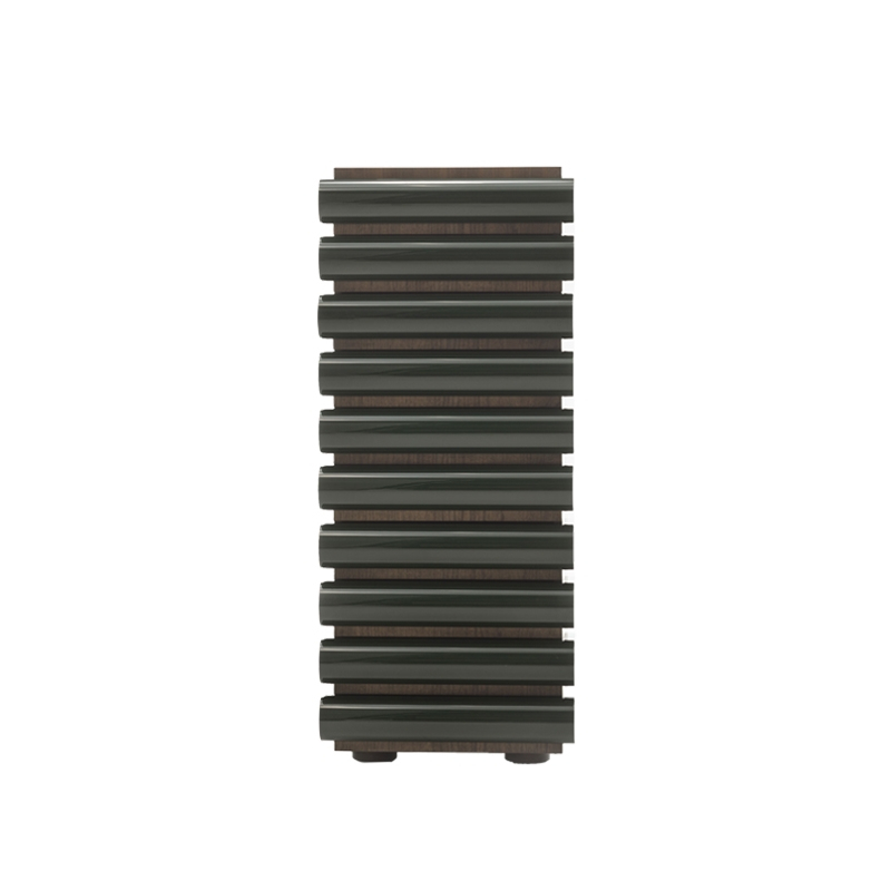 The structure of Storet is made of stained walnut wood, and each of its drawers is dressed in a delicate lacquered coloured finish, which gives the piece of furniture its dynamism.