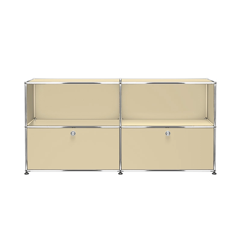 The Haller C2 storage unit has two hinged doors and two open modules. The Haller C2 furniture has a chrome-plated steel structure assembled by connecting balls, clad in powder-coated steel panels and mounted on height-adjustable glides.  Classic doors that don't require keys. (Secure on delivery, the doors unlock for the first time using a coin or a normal key)