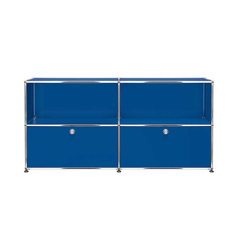 The Haller C2 storage unit has two hinged doors and two open modules. The Haller C2 furniture has a chrome-plated steel structure assembled by connecting balls, clad in powder-coated steel panels and mounted on height-adjustable glides.  Classic doors that don't require keys. (Secure on delivery, the doors unlock for the first time using a coin or a normal key)