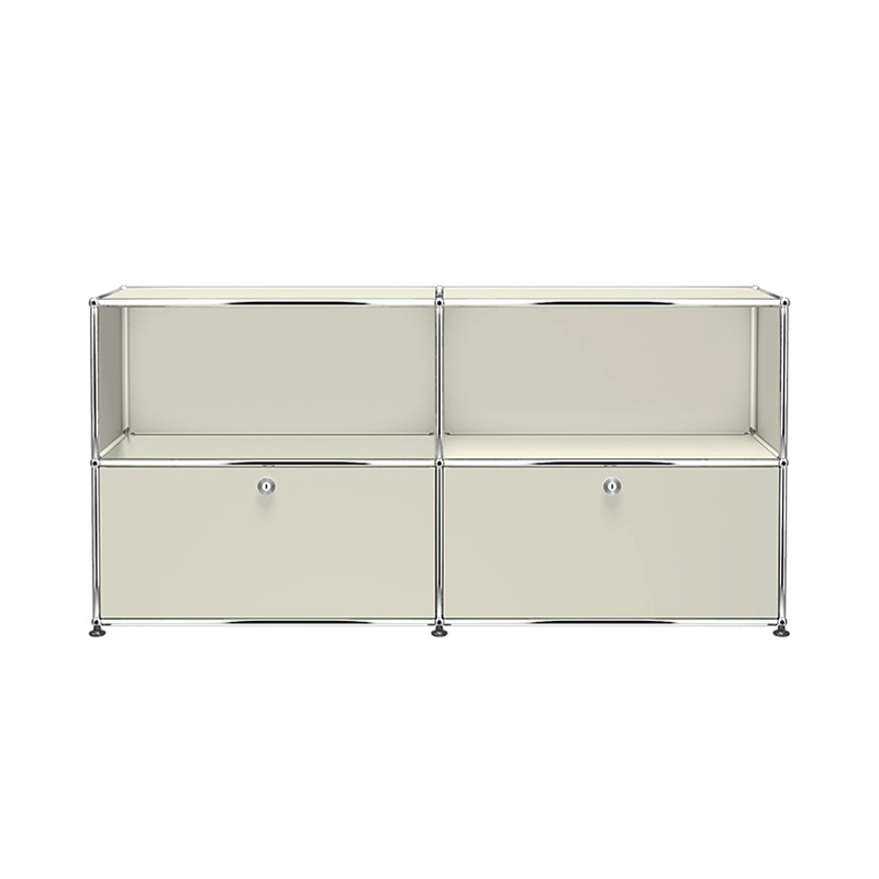 The Haller C2 storage unit has two hinged doors and two open modules. The Haller C2 furniture has a chrome-plated steel structure assembled by connecting balls, clad in powder-coated steel panels and mounted on height-adjustable glides.  Classic doors that don't require keys. (Secure on delivery, the doors unlock for the first time using a coin or a normal key)