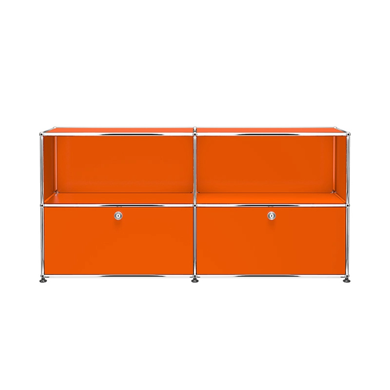 The Haller C2 storage unit has two hinged doors and two open modules. The Haller C2 furniture has a chrome-plated steel structure assembled by connecting balls, clad in powder-coated steel panels and mounted on height-adjustable glides.  Classic doors that don't require keys. (Secure on delivery, the doors unlock for the first time using a coin or a normal key)