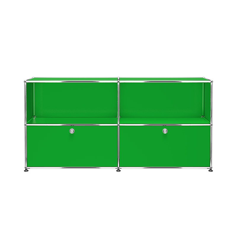 The Haller C2 storage unit has two hinged doors and two open modules. The Haller C2 furniture has a chrome-plated steel structure assembled by connecting balls, clad in powder-coated steel panels and mounted on height-adjustable glides.  Classic doors that don't require keys. (Secure on delivery, the doors unlock for the first time using a coin or a normal key)