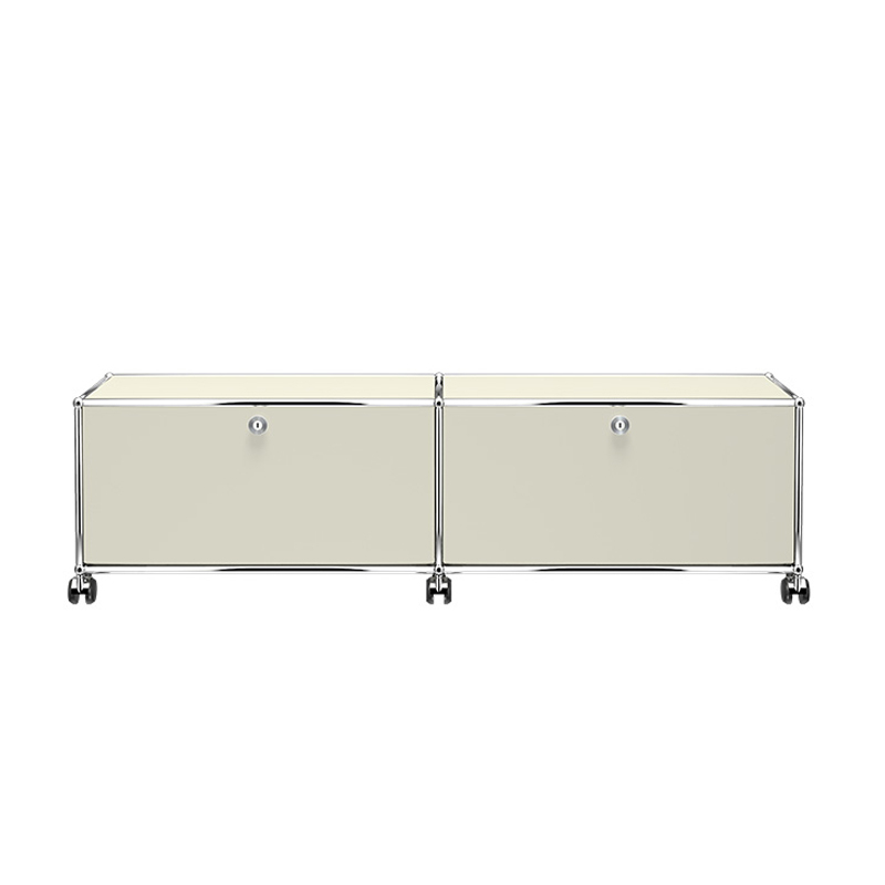 The meuble Haller M61 has 2 hinged doors, an intermediate shelf, a cable management cut-out and is fitted with castors. The meuble Haller M61 has a chrome-plated steel structure assembled by connecting balls, clad in powder-coated steel panels and mounted on castors. Classic doors that don't require keys. (Secure on delivery, the doors unlock for the first time using a coin or a normal key)