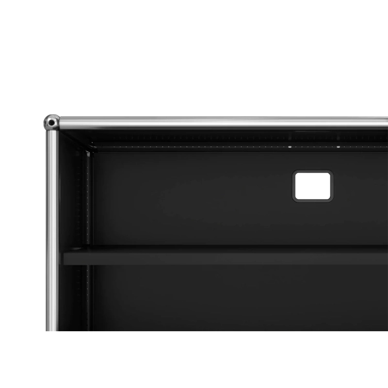 The meuble Haller M61 has 2 hinged doors, an intermediate shelf, a cable management cut-out and is fitted with castors. The meuble Haller M61 has a chrome-plated steel structure assembled by connecting balls, clad in powder-coated steel panels and mounted on castors. Classic doors that don't require keys. (Secure on delivery, the doors unlock for the first time using a coin or a normal key)