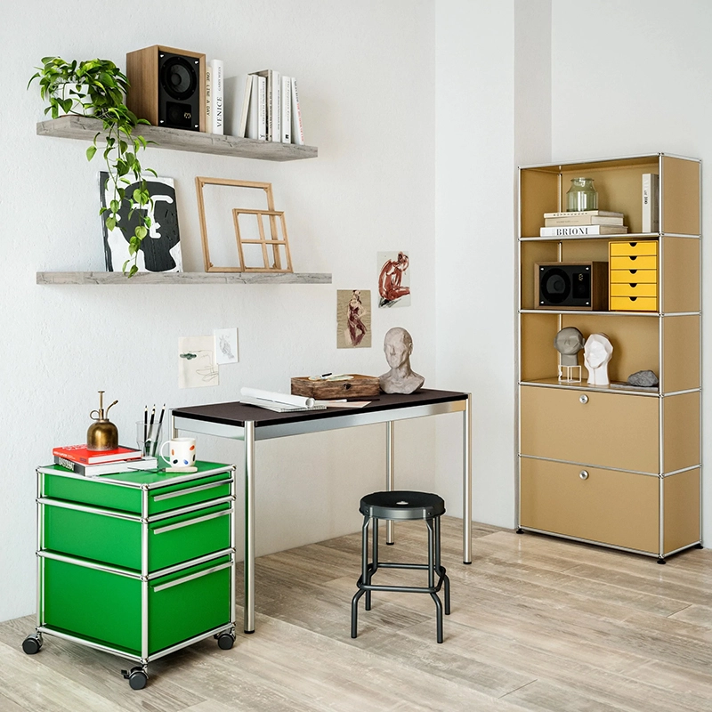 Created by architect Fritz Haller and visionary industrialist Paul Schärer, USM furniture has been made in Switzerland for over 50 years and is recognised the world over. The build quality of USM HALLER furniture and its timeless lines make it an essential design classic, equally at home in offices and the most beautiful interiors, whether classic or modern. Its modular design means that it can be upgraded over time as needs and desires change. The USM Haller M63 pedestal on castors has three drawers, two Inos bins with inserts, and a counterweight. The meuble Haller M63 has a chrome-plated steel structure assembled by connecting balls, clad in powder-coated steel panels and mounted on height-adjustable glides. It's the perfect addition to any home office.