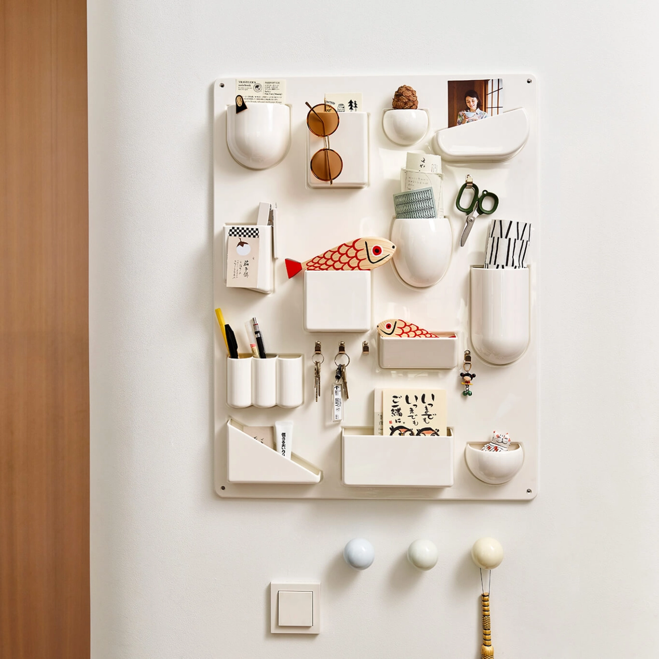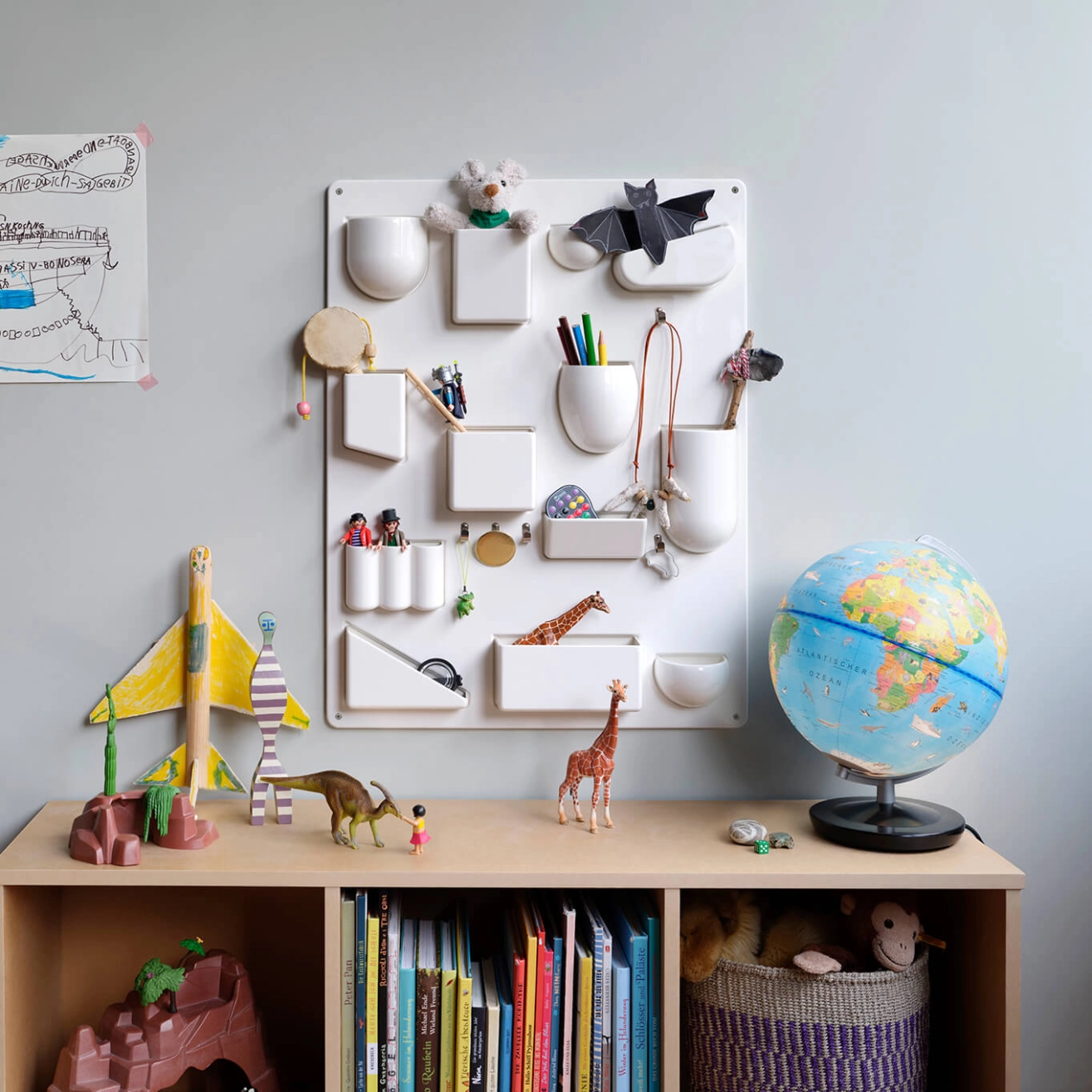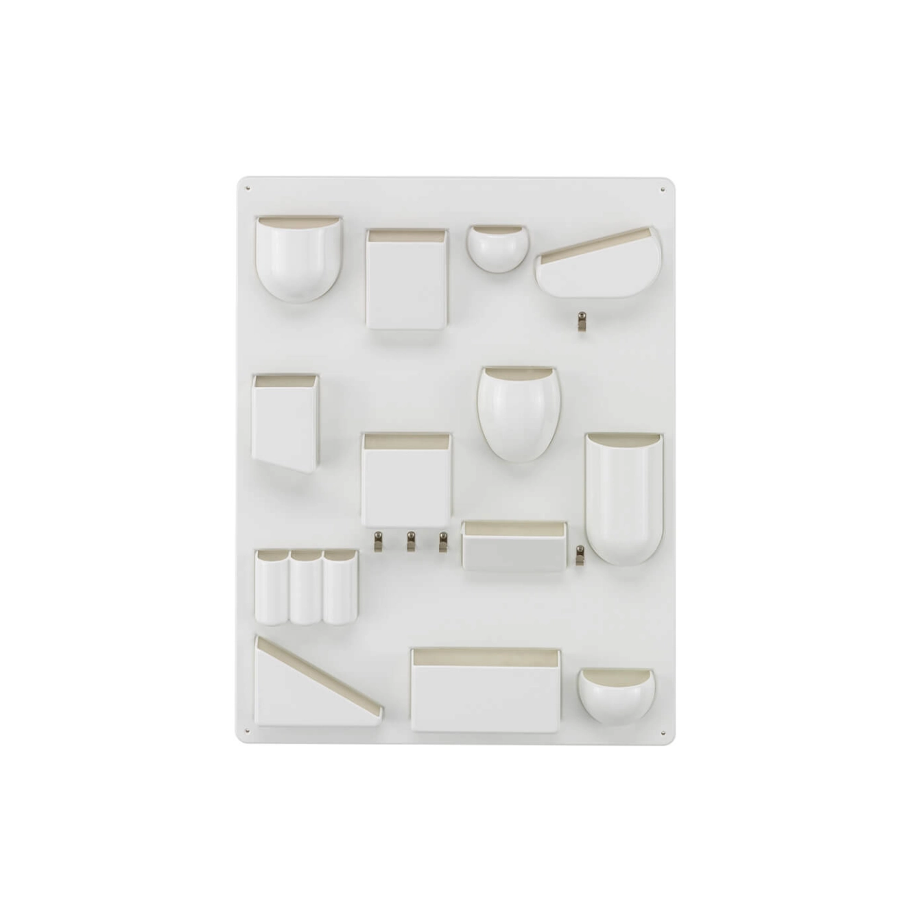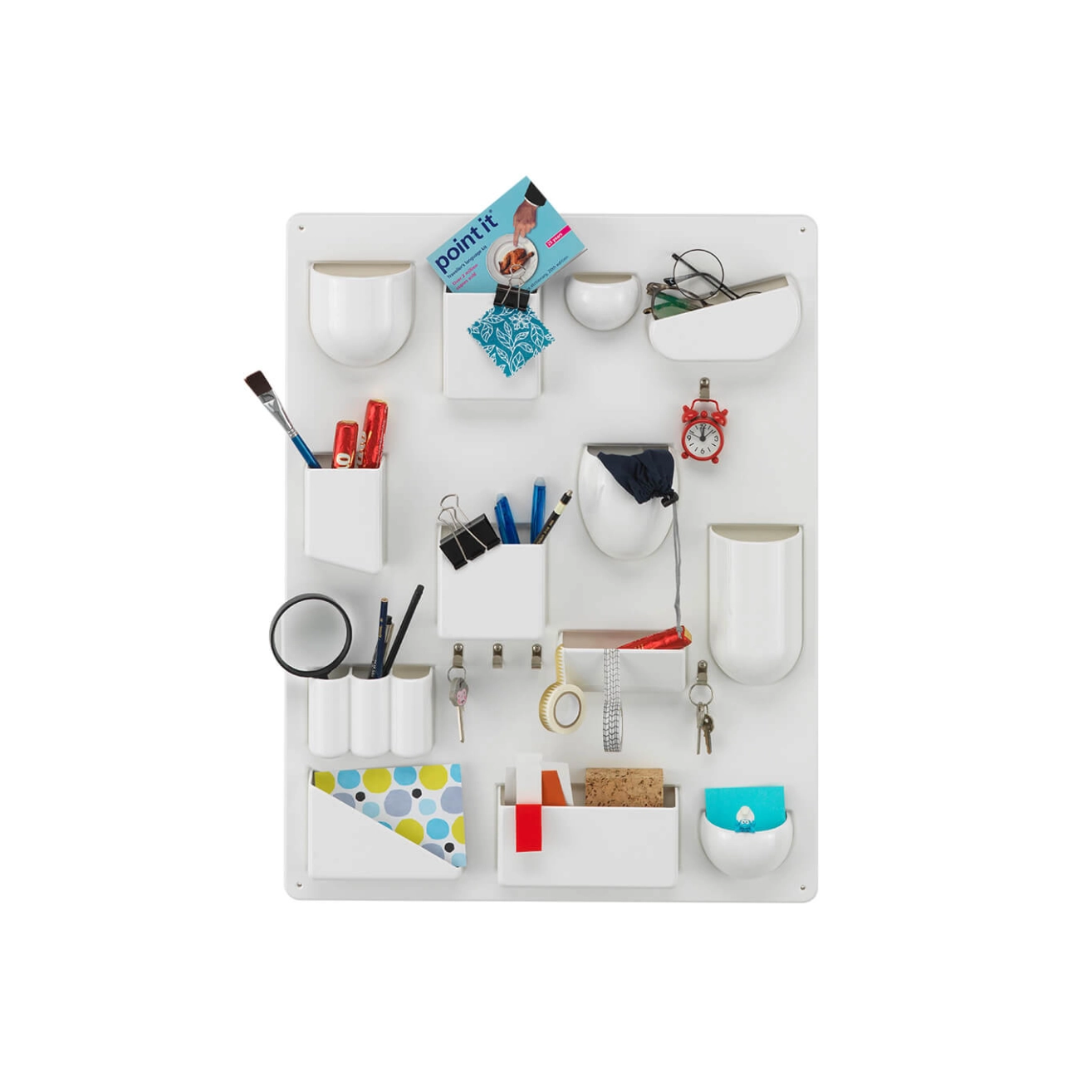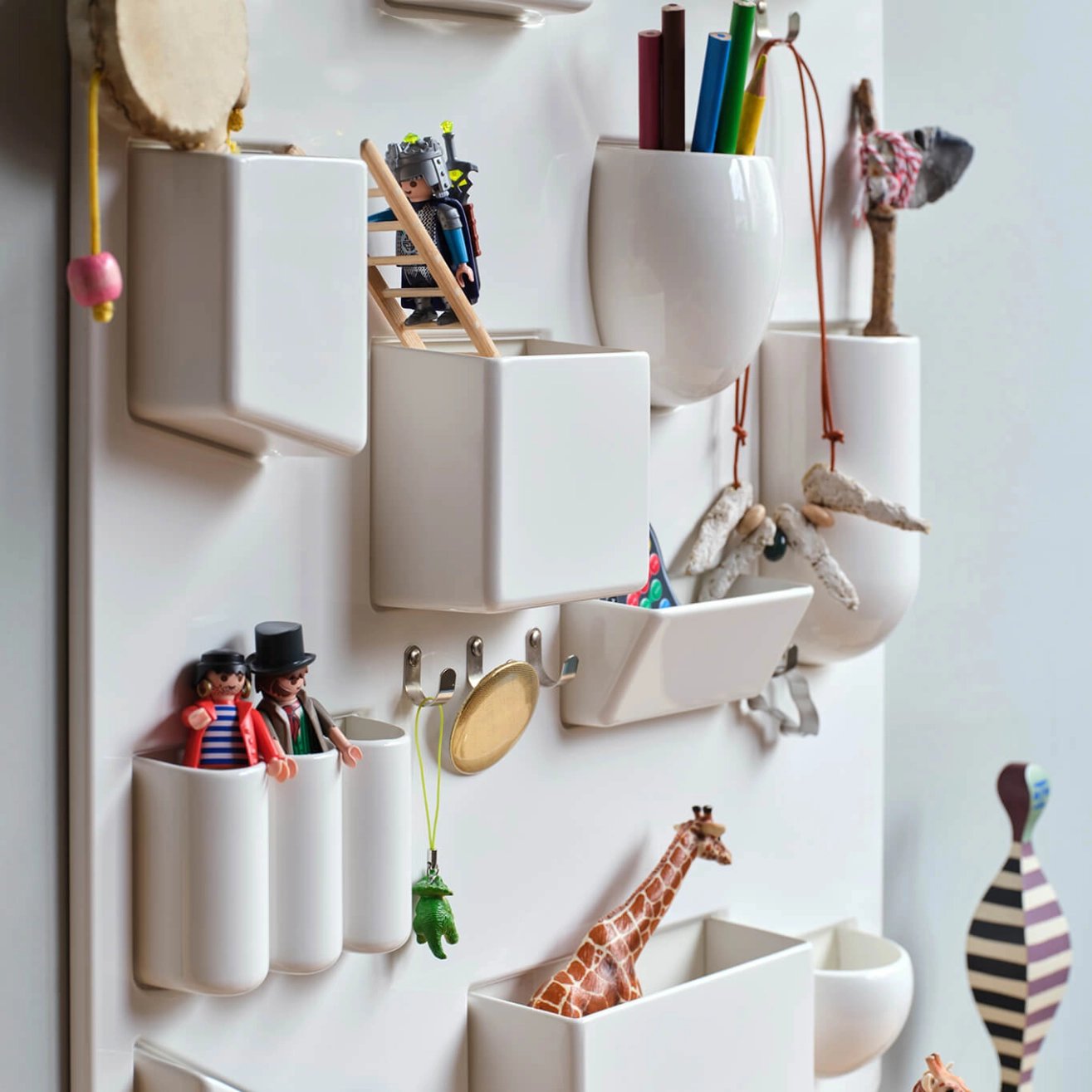 Created by Dorothée Becker in 1969, Uten.silo is a very practical wall-hung storage panel. With receptacles of various shapes and sizes, hooks and metal clips, the Uten.Silo brings order to offices, kitchens, workshops and bathrooms. This fun accessory is also suitable for children's bedrooms, where it will teach them to put away their pencils, rubbers and felt-tip pens. It is available in white, black or red to suit each of your rooms. A 70s design icon, the Uten.silo is an accessory that combines industrial precision with a humorous layout, essential for anyone who struggles to keep a tidy space invaded by all those little everyday items. Now produced in recycled plastic by Vitra, Uten.Silo is available in the original 1969 size - Uten.Silo I, as well as the smaller version issued in 1970 - Uten.Silo II.