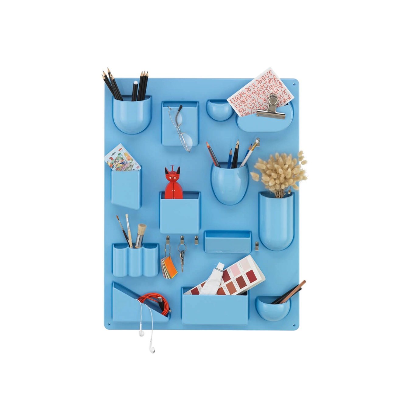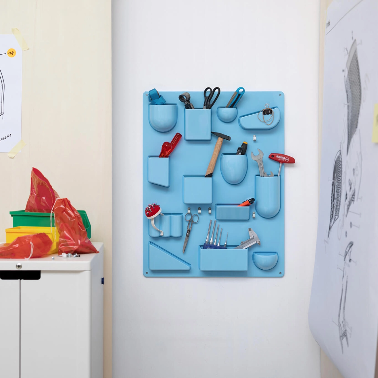 Created by Dorothée Becker in 1969, Uten.silo is a very practical wall-hung storage panel. With receptacles of various shapes and sizes, hooks and metal clips, the Uten.Silo brings order to offices, kitchens, workshops and bathrooms. This fun accessory is also suitable for children's bedrooms, where it will teach them to put away their pencils, rubbers and felt-tip pens. It is available in white, black or red to suit each of your rooms. A 70s design icon, the Uten.silo is an accessory that combines industrial precision with a humorous layout, essential for anyone who struggles to keep a tidy space invaded by all those little everyday items.