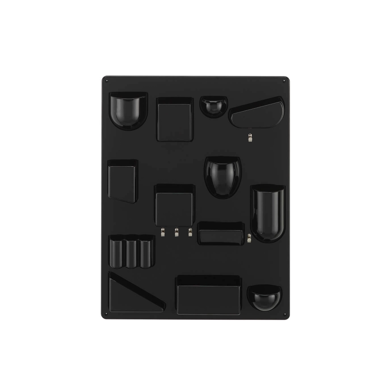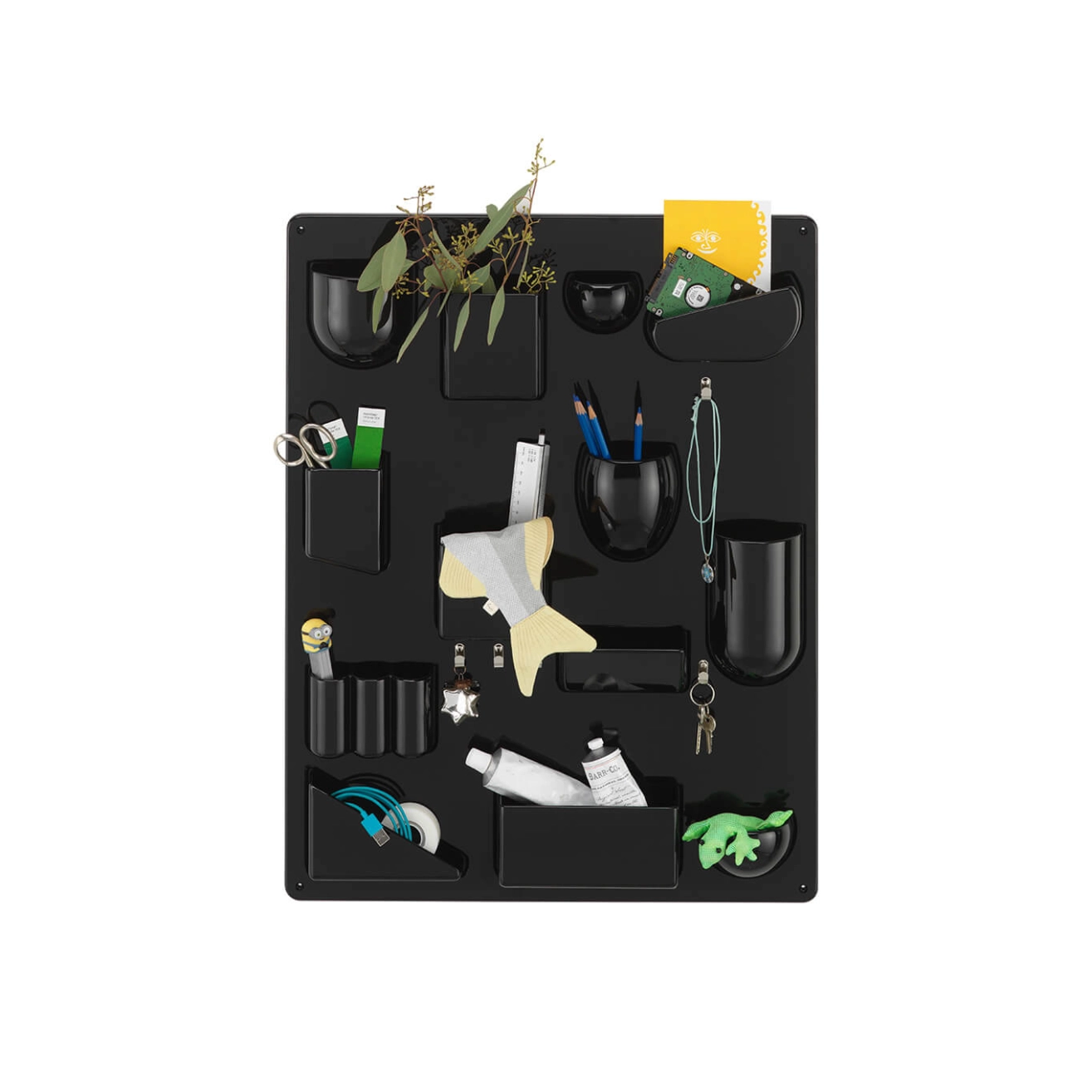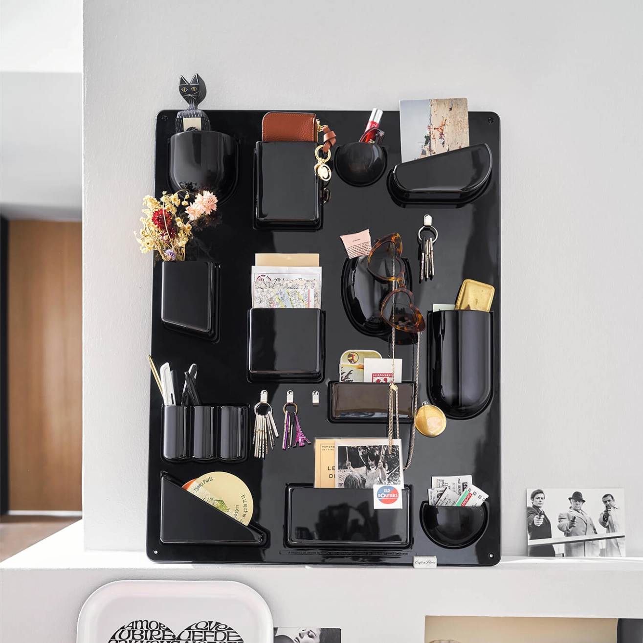 Created by Dorothée Becker in 1969, Uten.silo is a very practical wall-hung storage panel. With receptacles of various shapes and sizes, hooks and metal clips, the Uten.Silo brings order to offices, kitchens, workshops and bathrooms. This fun accessory is also suitable for children's bedrooms, where it will teach them to put away their pencils, rubbers and felt-tip pens. It is available in white, black or red to suit each of your rooms. A 70s design icon, the Uten.silo is an accessory that combines industrial precision with a humorous layout, essential for anyone who struggles to keep a tidy space invaded by all those little everyday items. Now produced in recycled plastic by Vitra, Uten.Silo is available in the original 1969 size - Uten.Silo I, as well as the smaller version issued in 1970 - Uten.Silo II.