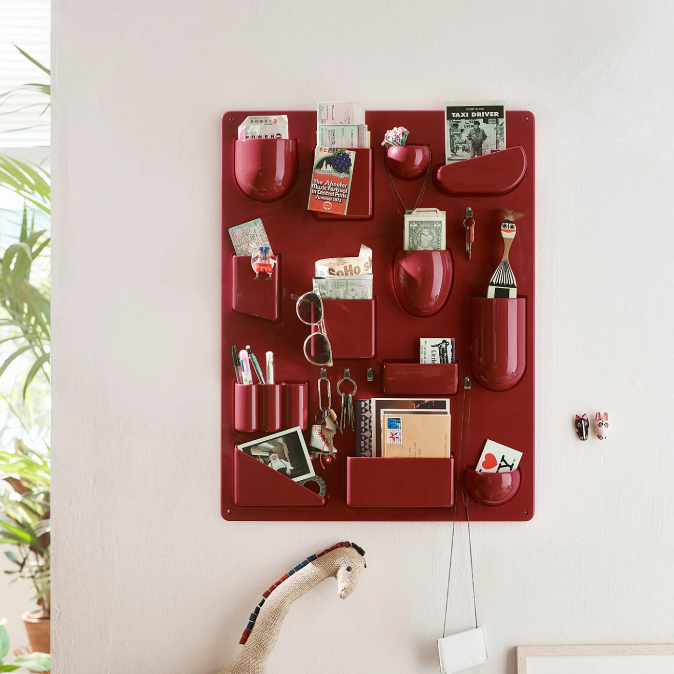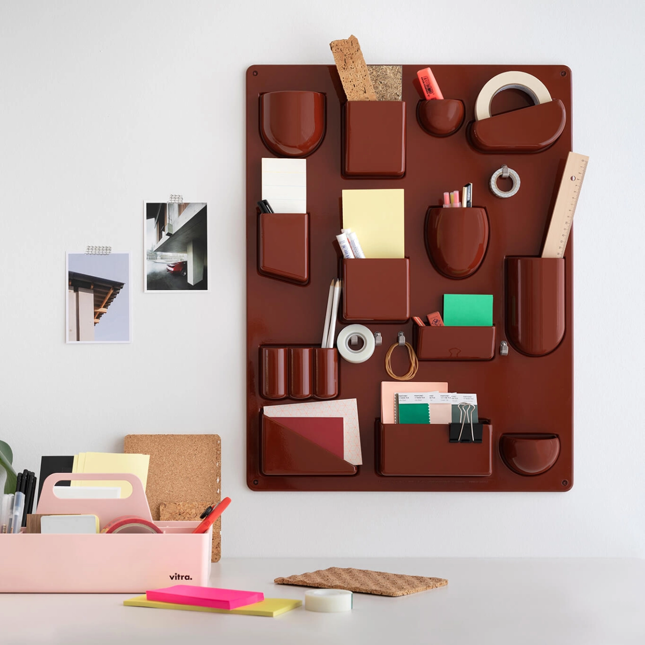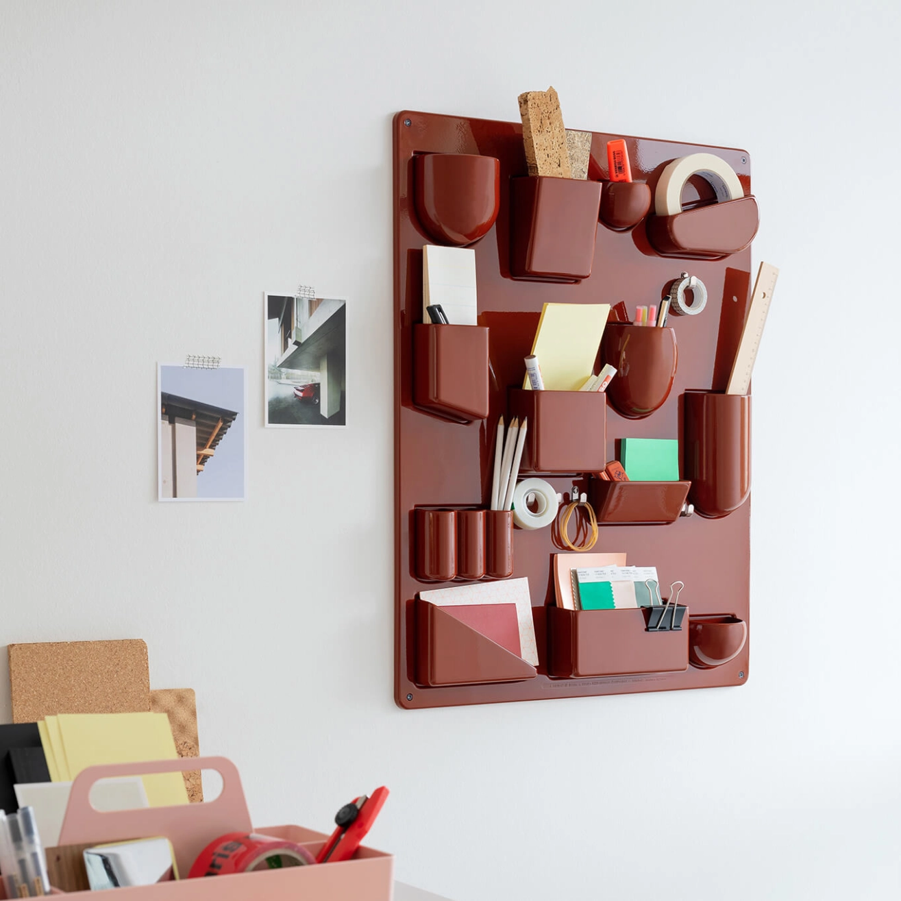 Created by Dorothée Becker in 1969, Uten.silo is a very practical wall-hung storage panel. With receptacles of various shapes and sizes, hooks and metal clips, the Uten.Silo brings order to offices, kitchens, workshops and bathrooms. This fun accessory is also suitable for children's bedrooms, where it will teach them to put away their pencils, rubbers and felt-tip pens. It is available in white, black or red to suit each of your rooms. A 70s design icon, the Uten.silo is an accessory that combines industrial precision with a humorous layout, essential for anyone who struggles to keep a tidy space invaded by all those little everyday items. Now produced in recycled plastic by Vitra, Uten.Silo is available in the original 1969 size - Uten.Silo I, as well as the smaller version issued in 1970 - Uten.Silo II.