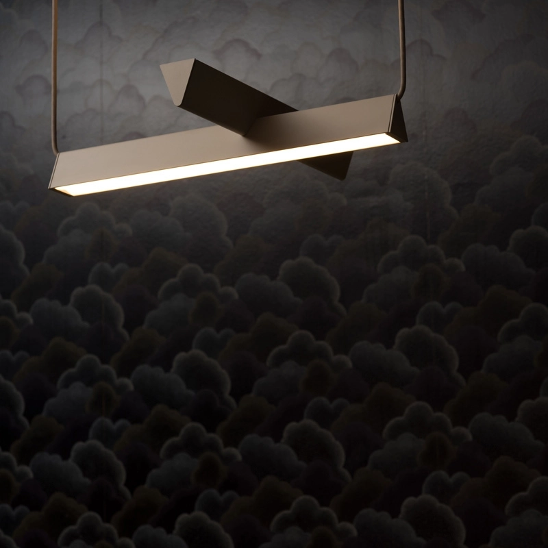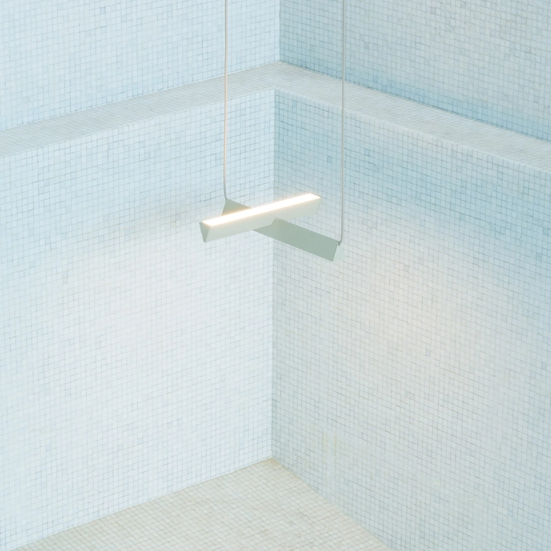 The Mile collection is the result of a collaboration between Lambert & Fils and designer Guillaume Sasseville. Mile is a series of linear suspensions, whose form is reduced to its simplest expression. Giving a surprising sense of equilibrium, a pivot separates the two asymmetrical lines of the light. Direct and indirect lighting are superimposed to mark the space with their luminous traits, adding a certain presence wherever this suspension light is located. Halfway between an installation and a functional object, the Mile collection achieves its authenticity through the different contrasts it offers. Its use of linear LEDs and wires clamped into the structure accentuates the impression of the weightlessness, even levitation, of the Mile light.
