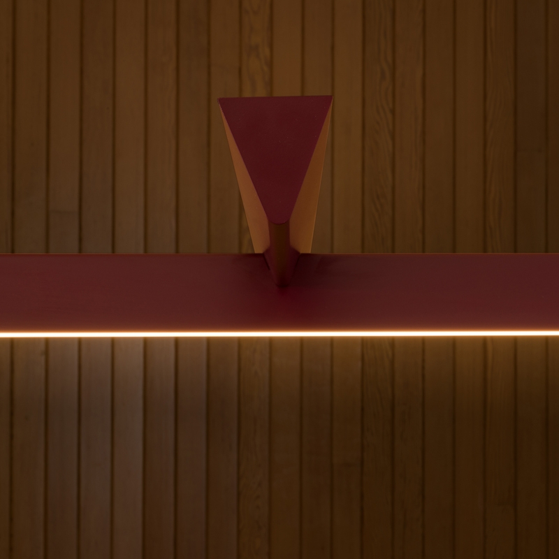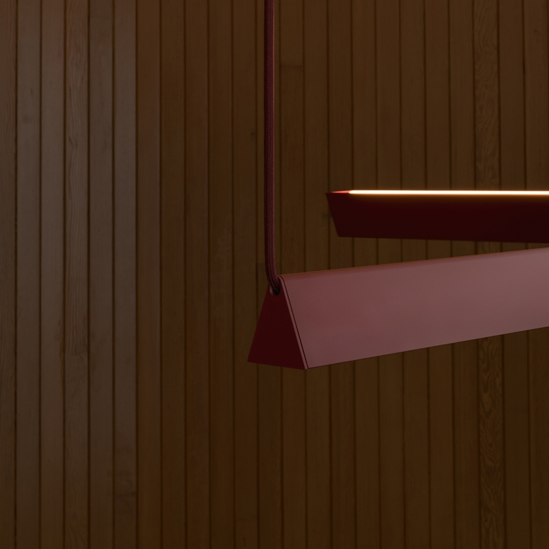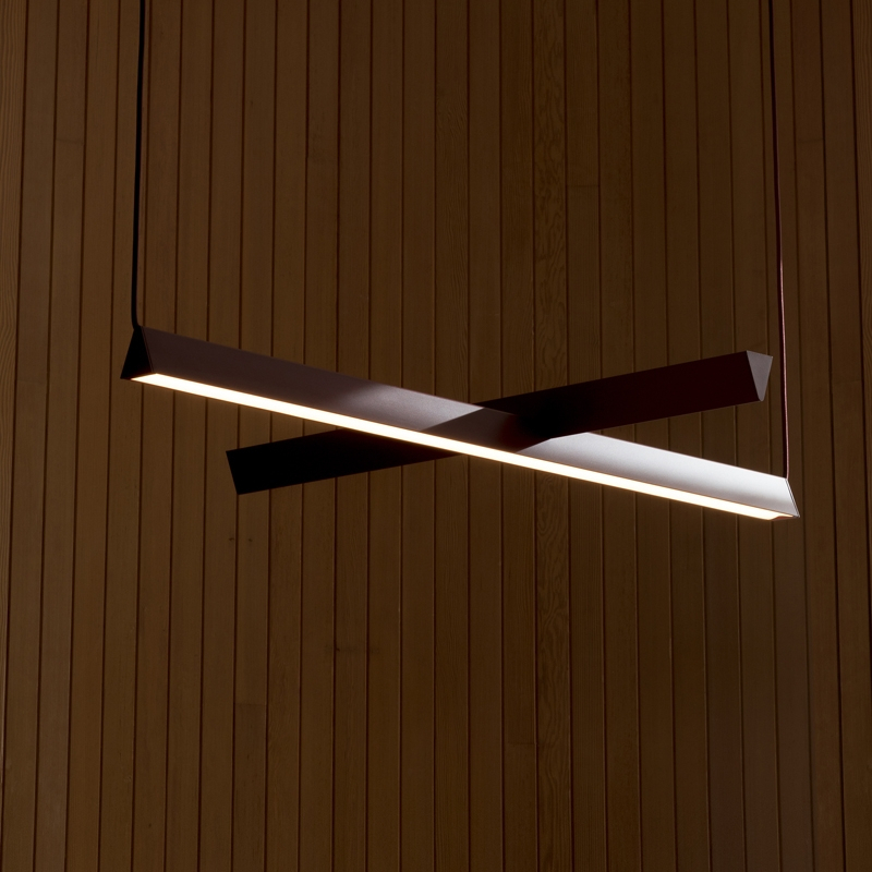 Lambert & Fils and designer Guillaume Sasseville. Mile is a collection of linear suspension lights, whose shape is pared down to its simplest expression. Giving a surprising sense of equilibrium, a pivot separates the two asymmetrical lines of the light. Direct and indirect lighting are superimposed to mark the space with their luminous traits, adding a certain presence wherever this suspension light is located. Halfway between an installation and a functional object, the