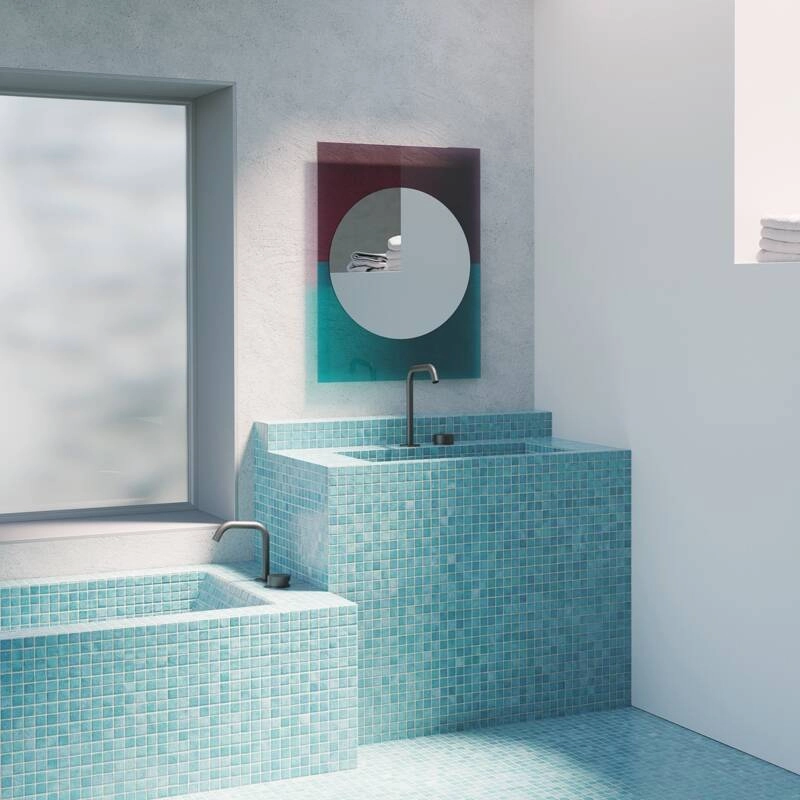 Assembled, the small models form a mosaic of solids and voids. The generous sizes of the two larger models mean they can be used in a variety of ways around the home, either vertically or horizontally. The original and ingenious hanging system allows the Wander mirror to levitate on the wall, projecting its colours onto it in a halo.
