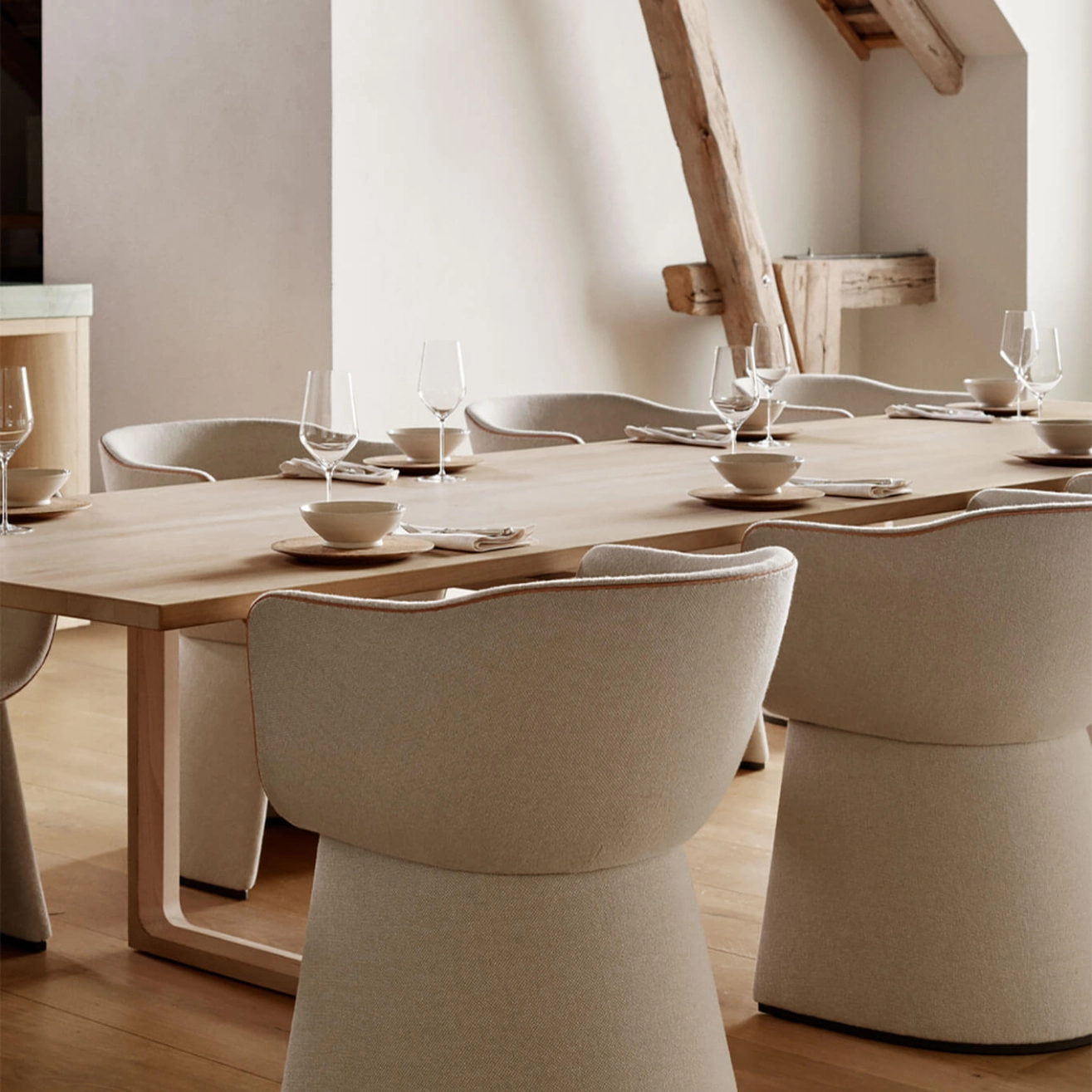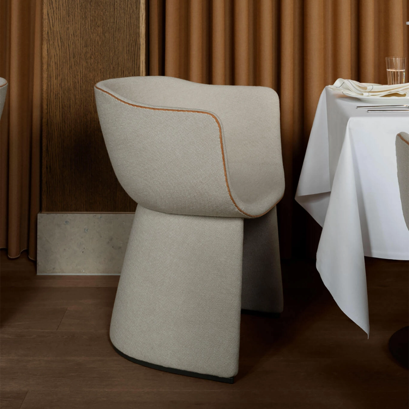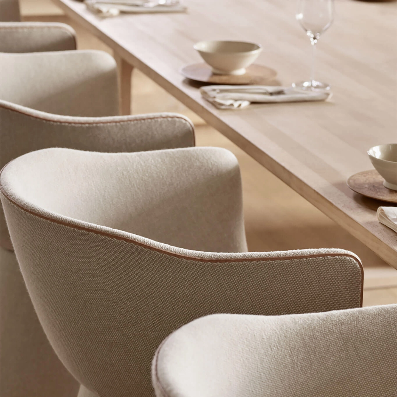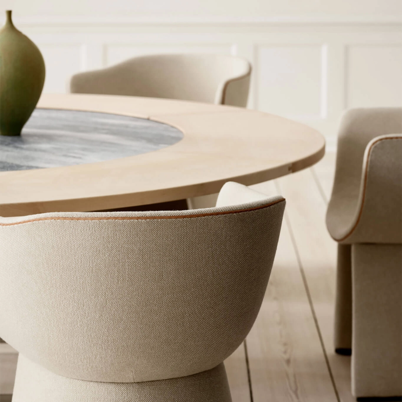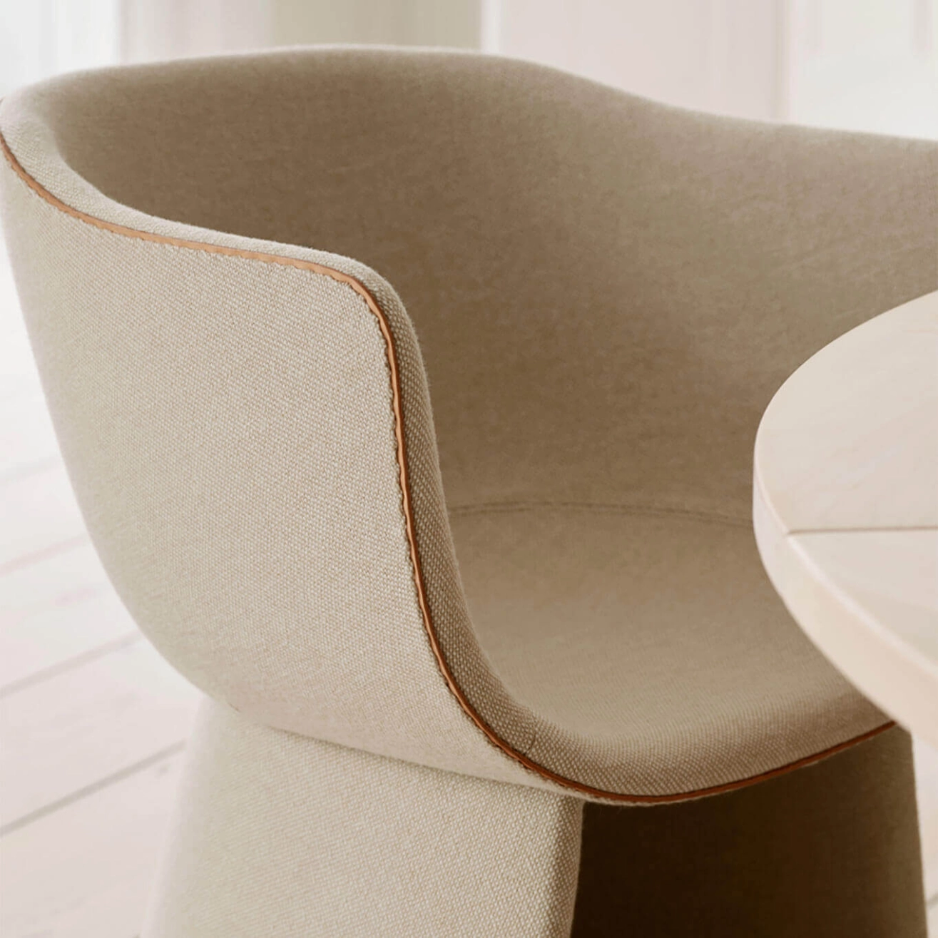 The Monolit chair, designed by the talented Danish designer Cecilie Manz and produced by Fritz Hansen, is a piece of furniture that combines comfort, functionality, and modern aesthetics. Perfectly suited for long meals or moments of relaxation in contemporary spaces, it stands out with its sleek silhouette and enveloping shape, creating an intimate and pleasant atmosphere. Its carefully crafted design allows for the storage of personal items underneath the seat, providing a private and practical space for the user. The Monolit chairs are fully customizable, offering the possibility to choose colors and textiles tailored to your preferences, in one or two materials. This customization allows each user to adapt the chair to their interior, whether in a formal or more relaxed setting. The elegant leather piping emphasizes the chair's slender silhouette, while adding a touch of understated sophistication that enhances every moment shared around the table or in a lounge area. Cecilie Manz, who grew up in an artistic environment with artist parents, has always been immersed in the world of design. A graduate of the Royal Danish Academy of Fine Arts, she also studied at the University of Art and Design in Helsinki before founding her own company in 1997. Since then, she has created a series of iconic pieces focused on the balance between functionality, minimalist aesthetics, and quality materials. The Monolit chair is a perfect example of her approach, combining timeless design with a keen attention to detail. Thanks to its contemporary and graceful style, the Monolit chair does not just fulfill a function, it creates a unique experience for those who use it. Offering both comfort and elegance, it transforms every moment into a memorable occasion.