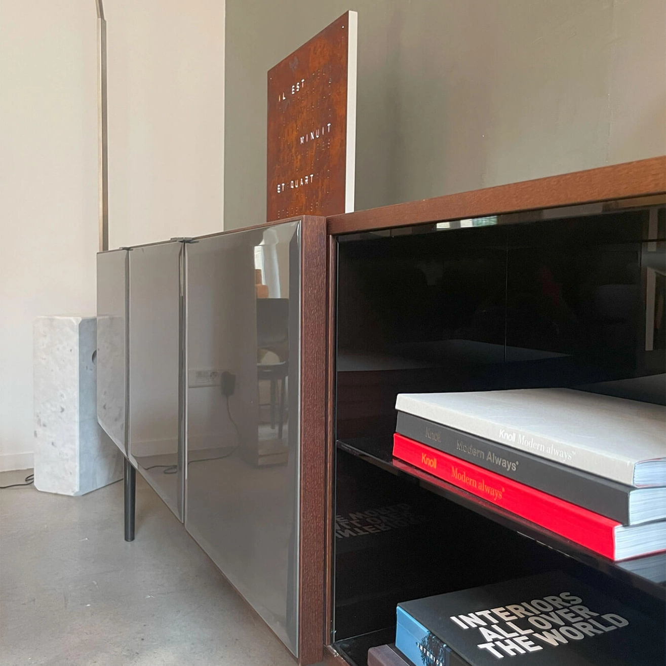 Structure in MDF veneered in tobacco-stained oak, glossy granite lacquer