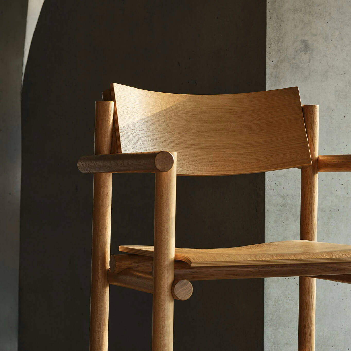 Jonathan Muecke approaches both furniture and sculpture with the intention of revealing and expressing the inherent logic of his materials. The Muecke Wood Chair was born from his desire to celebrate all the qualities of wood, including the often-hidden end grain. To achieve this, he shapes the wood into rounded dowels and develops a joinery method that connects them where they intersect, using a floating tenon. “You can understand the piece of wood,” he explains. “It isn’t disguised. It’s there for you to understand again and again.” This approach highlights the natural beauty of the material while revealing a clear and coherent structure. The distinctive joinery system is repeated throughout the entire collection, named the Muecke Wood Collection.