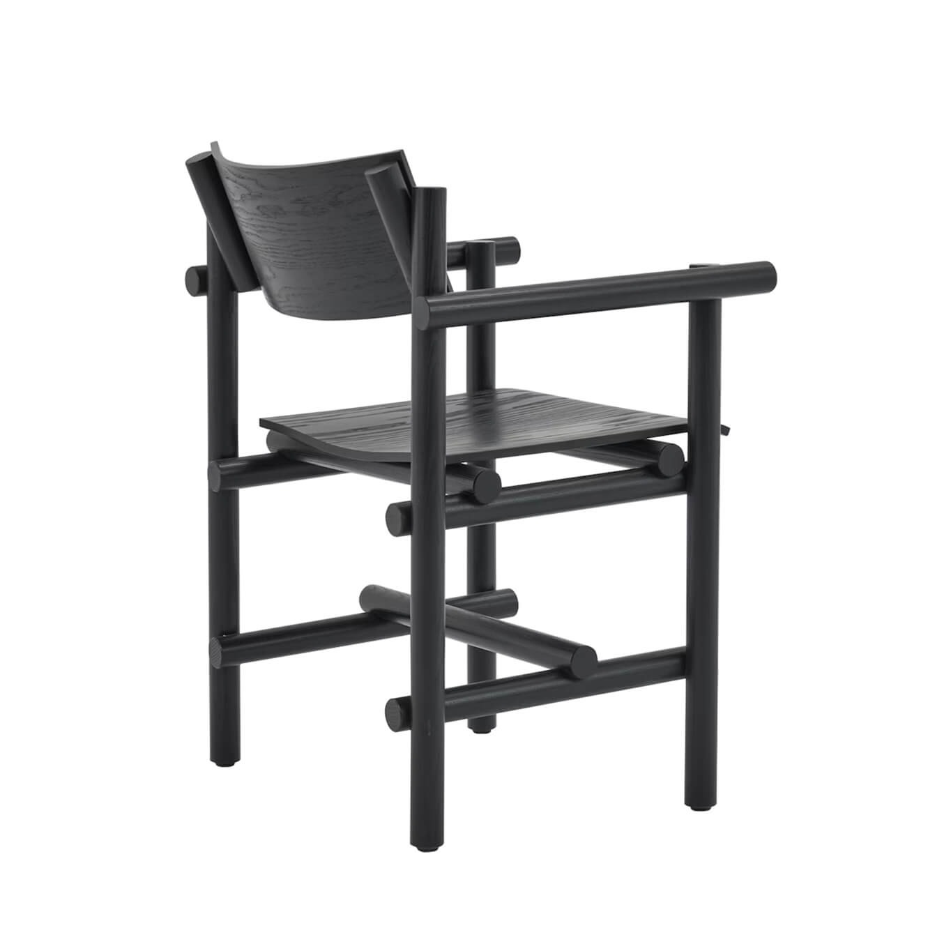 Solid wood base, ebonized ash finish, seat and backrest in bent plywood covered with a sliced wood veneer