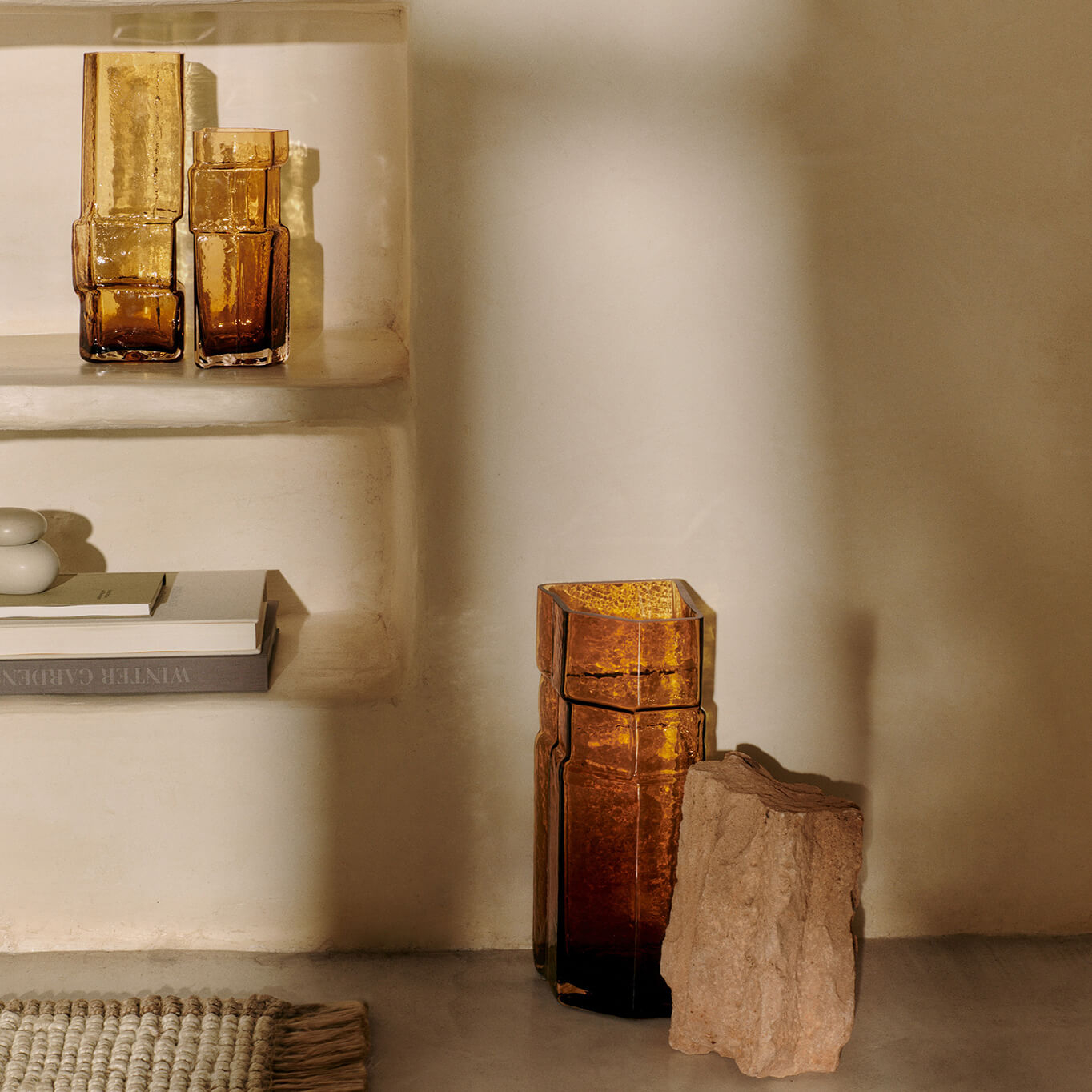 The Muro collection by Ferm Living takes its name from the Spanish word for “wall,” reflecting its architectural origins and connection to Can Lis. This trio of mouth-blown recycled glass vases, each with distinct sizes and shapes, draws inspiration from the texture and structure of bricks. Crafted using molds made from real bricks, the vases showcase subtle architectural nuances, while the mouth-blowing process gives each piece a unique artisanal character. Displayed individually or as a composition, the Muro Ferm Living vase is striking with or without flowers.