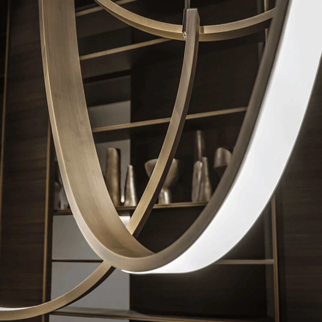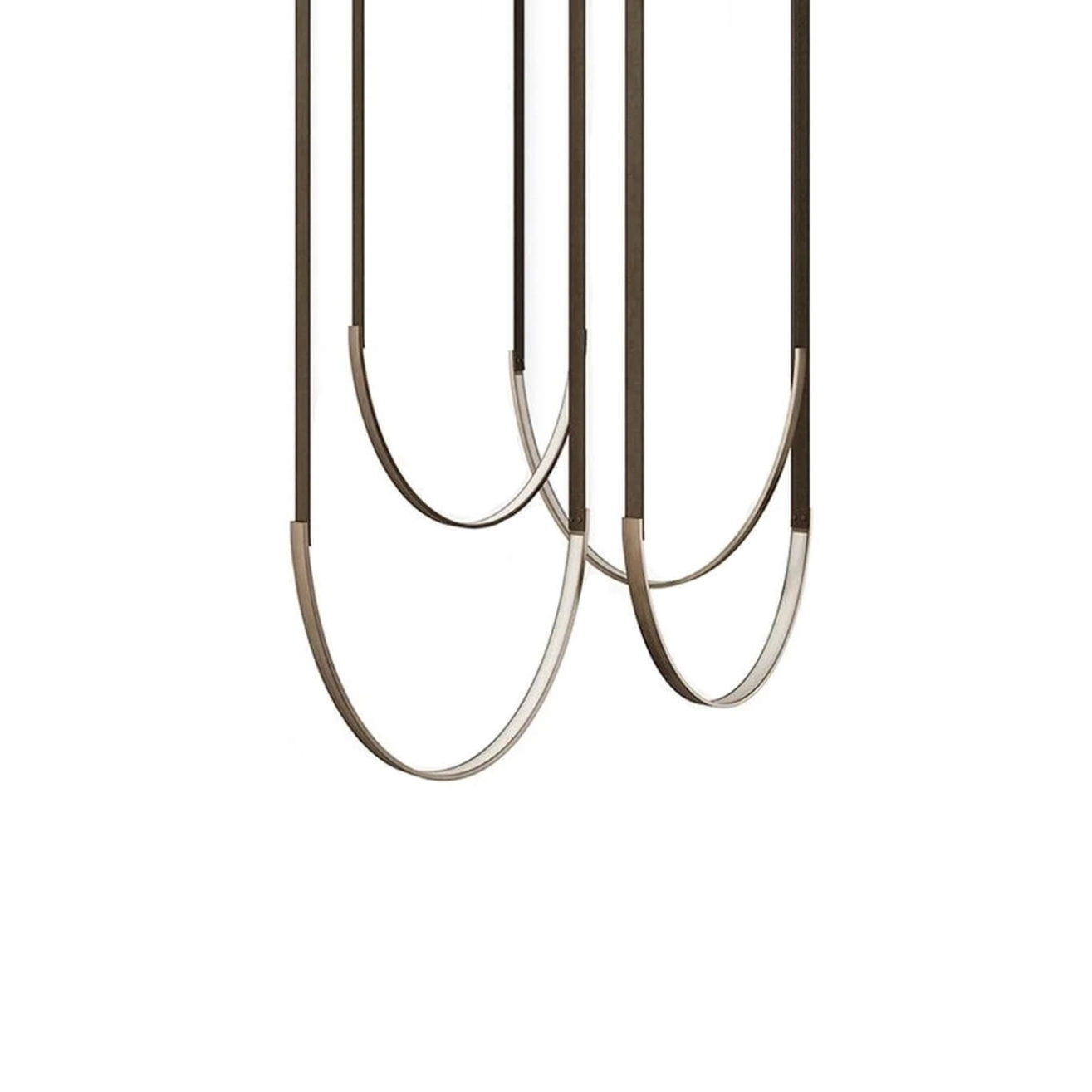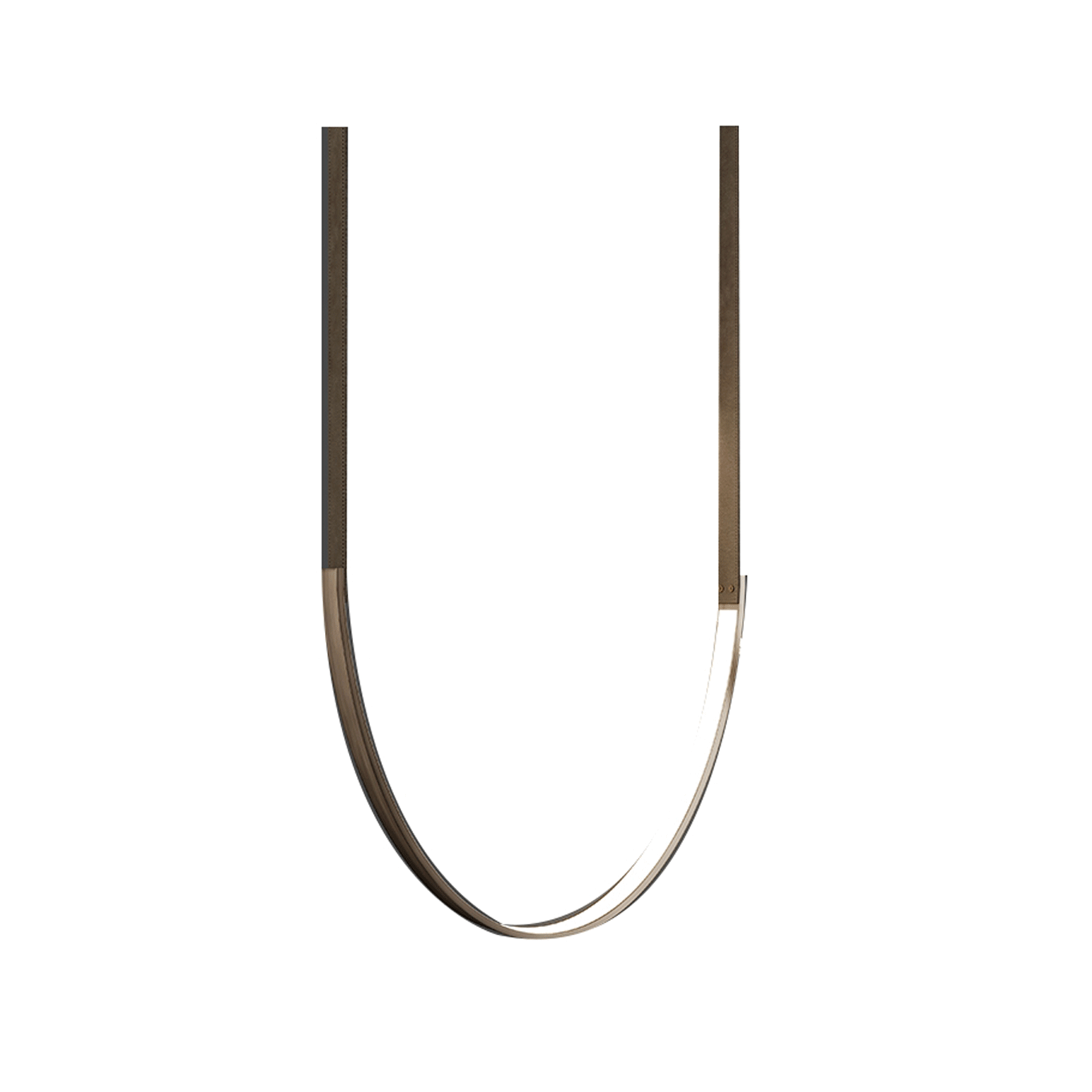 The Myline suspension light, a pre-owned piece designed by Italian designer Adele Martelli for Emmemobili, is a sculptural creation of striking elegance, conceived to transform light into a true work of art. Its airy design combines a suspended soft leather element with a slender brass structure, forming a play of graphic lines that seem to float in space. Thanks to this light and refined composition, Myline stands out as much as a decorative object as it does a functional light fixture. Designed to suit a wide range of interiors, Myline is available in multiple lengths, allowing for customizable configurations tailored to the needs of each project. The lighting is provided by a high-performance LED strip (ranging from 37.5 W to 49 W), emitting a warm glow indirectly toward the ceiling, creating a soft and enveloping atmosphere. This pre-owned light can also be adjusted via a dimmable system, ideal for setting the mood as desired. Blending noble materials with artisanal Italian craftsmanship, the Myline suspension fully embodies the philosophy of Emmemobili: a balance between sophistication, formal innovation, and technical excellence. Whether placed in a private living room, a hotel lobby, or a contemporary reception space, it asserts its presence as a sculptural design element—both subtle and expressive.