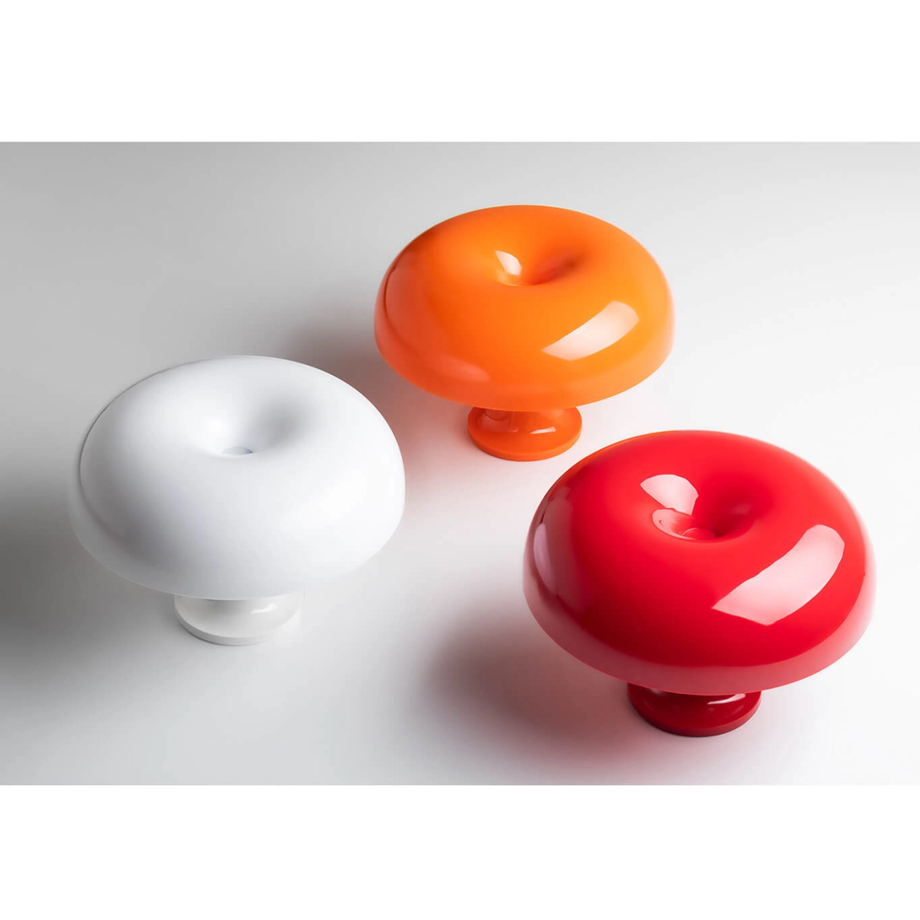 Designed by Giancarlo Mattioli, Nessino is the updated and revisited model of the famous Nesso table lamp produced by Artemide, which won first prize at the Artemide/Domus Studio Competition in Milan in 1965. It features an iconic mushroom shape and a 70s colour scheme. The body and diffuser are made of polycarbonate. It provides diffuse and colourful light. Nessino is available in differents colors. Nessino is available in white and orange, injecting a bright touch into your interior.