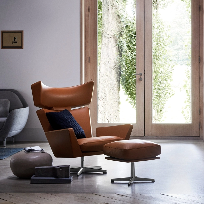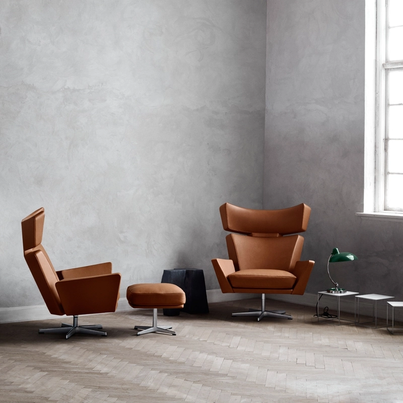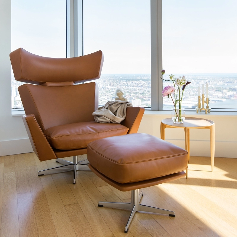 Arne Jacobsen presented for the first time in 1966 an armchair with a powerful look, the OKSEN armchair - the "bull" in Danish -. Unlike his other creations, Oksen is not only made from rounded organic shapes but makes a mark in any space with its strong and imposing angles. The artist's inspiration comes from a trip to the United States, during which he saw many reclining armchairs with angular shapes that were produced there at the time. Oksen is an eye-catcher in any room and also offers exceptional comfort. Several types of leathers are available for this chair that will seduce you at first sight.
