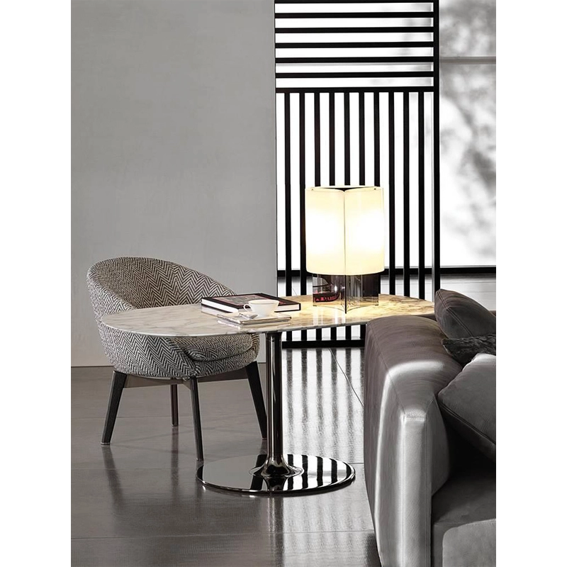 The inspiring principle behind the structure of the Oliver tables is based on a fascinating visual effect: that of a metal rod merging into a diffuse flow. In a gesture dear to the Modern Movement, the tube that forms the base of the Oliver table evolves into a circular shape offering a continuous shiny surface. Oliver has a precious top in Calacatta marble or grey stone. At 66 cm tall, it is the perfect match for armchairs or banquettes, and can be used as a dining table in a restaurant or as a small occasional desk in an interior. Designed by Rodolfo Dordoni, Oliver is a table that fully interprets the essence of Minotti's classic contemporaneity.