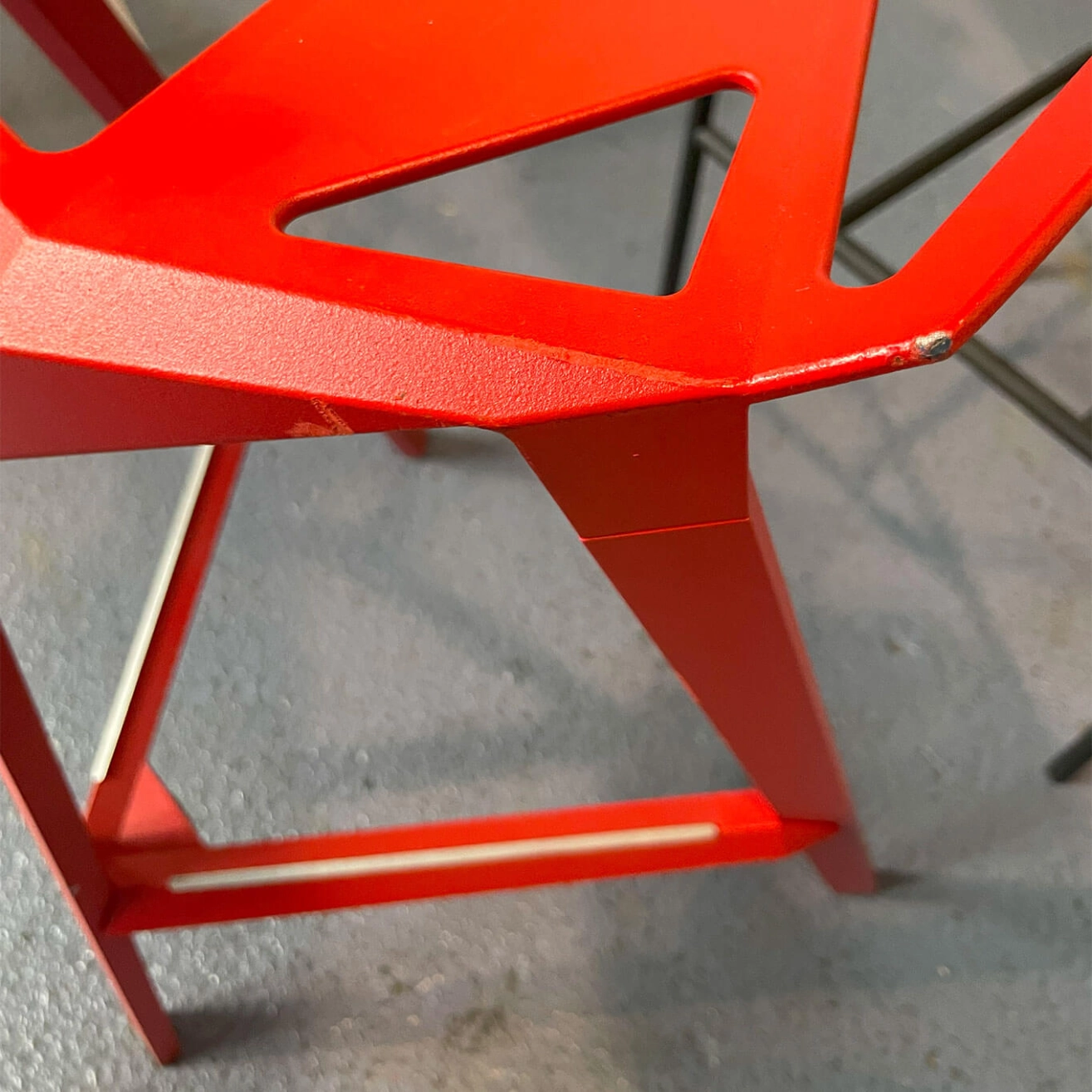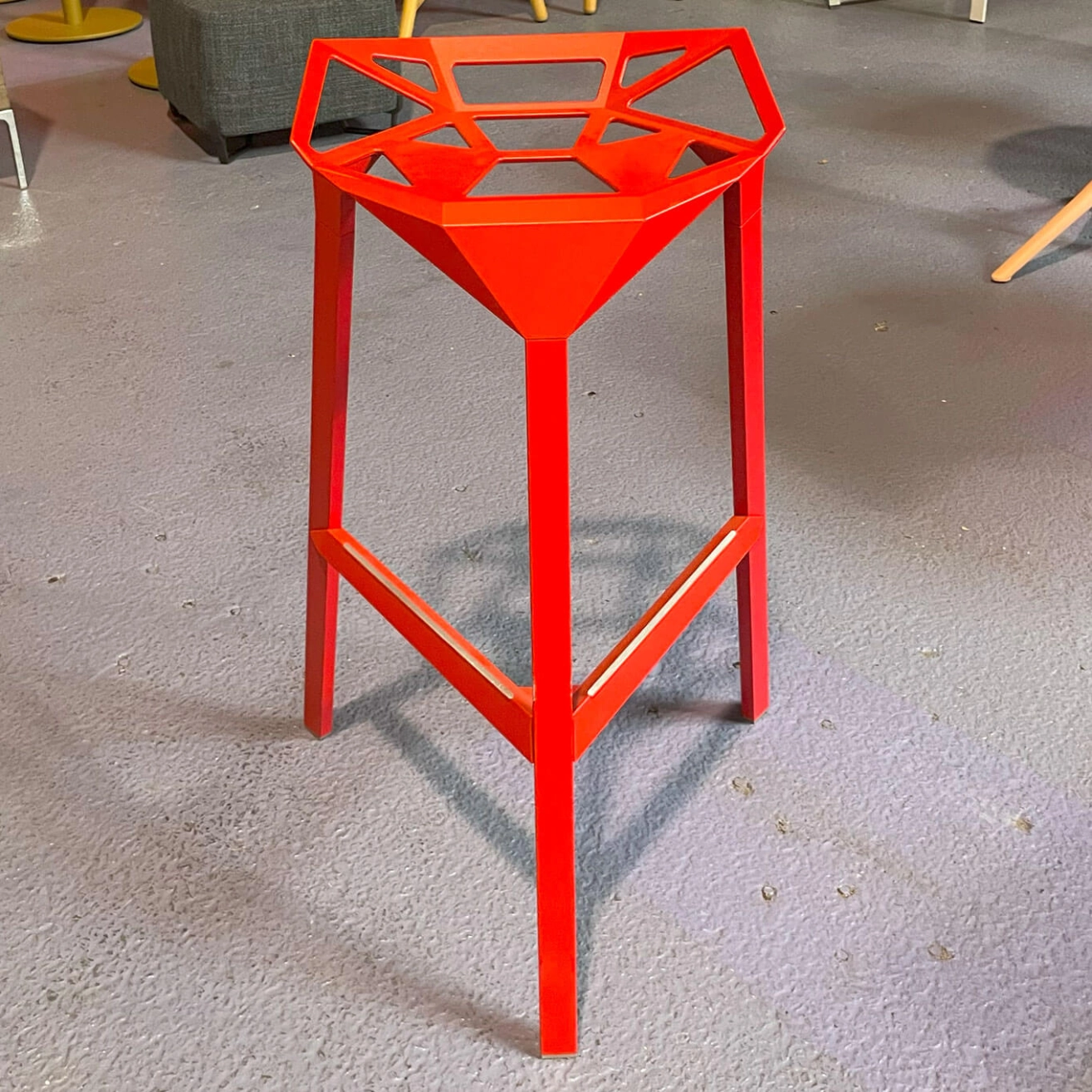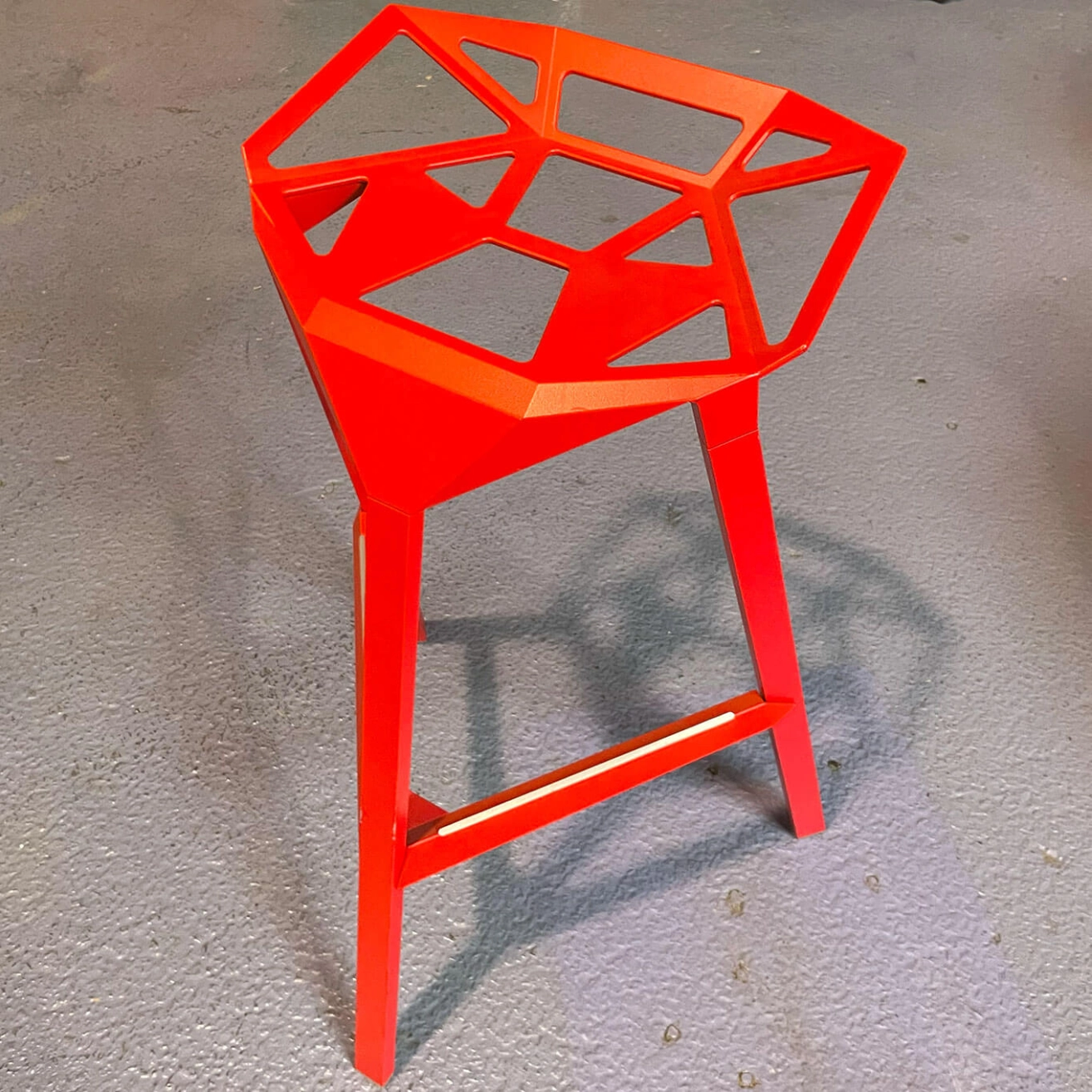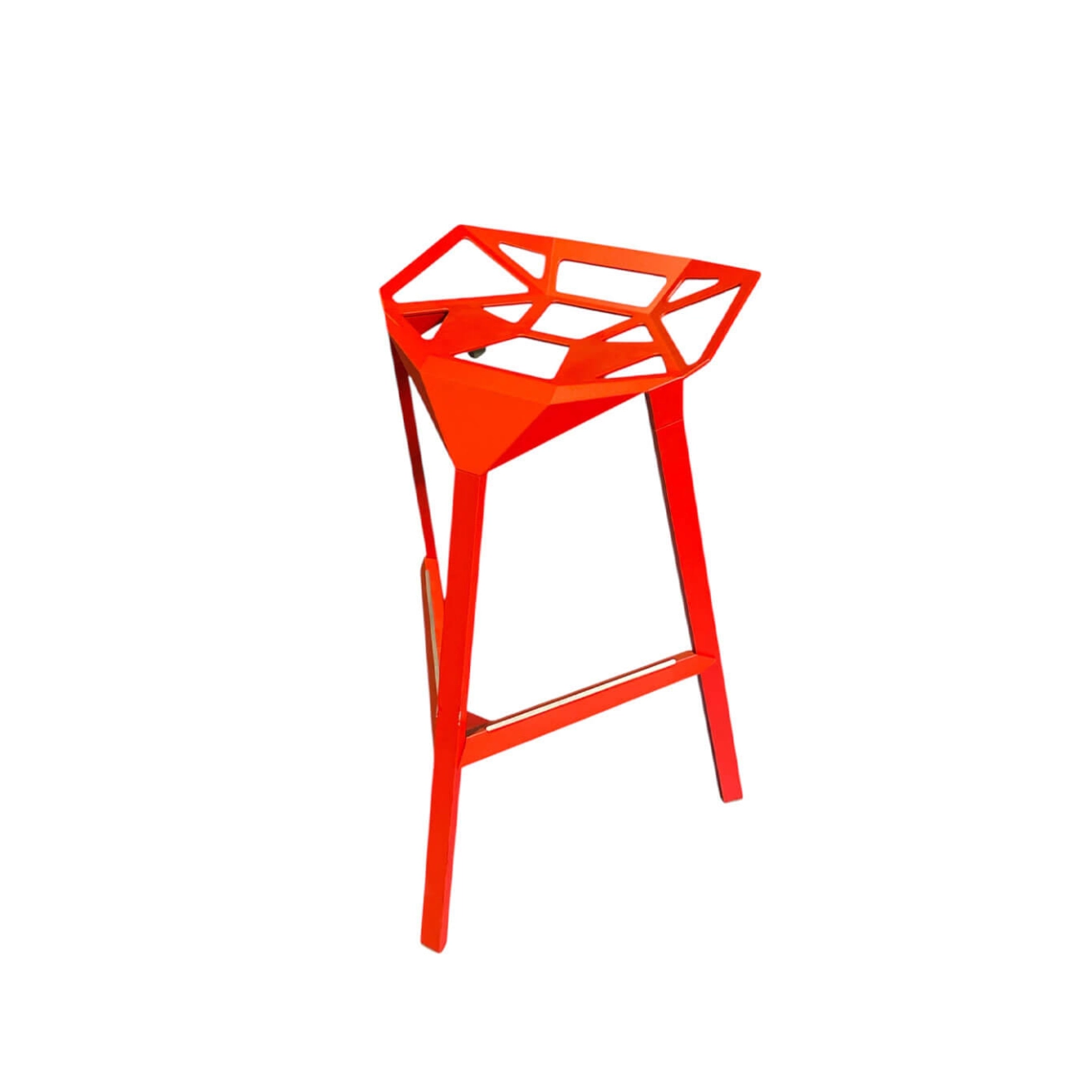 For over four decades, the Italian design house Magis has been pushing the boundaries of contemporary creation, offering furniture that is both innovative, functional, and timeless. Renowned for its ability to blend cutting-edge technology with local craftsmanship, Magis favors advanced manufacturing techniques such as Air Moulding, while maintaining 100% Italian production to preserve the region's artisanal excellence. The One H77 high stool, here offered as a pre-owned piece, is the work of renowned designer Konstantin Grcic. Its bold design is inspired by the geometric structure of a football, giving it a unique and architectural aesthetic. The seat shell, crafted from die-cast aluminum, features a pattern of perforated triangular facets that create a play of transparency and visual lightness, while ensuring exceptional strength and durability. Designed for both indoor and outdoor use, this stool combines minimalism with originality. Its graphic silhouette fits seamlessly into residential interiors as well as professional or event spaces. A true icon of industrial design, the One H77 perfectly embodies Magis’ vision: to create everyday objects that are as beautiful as they are intelligent.